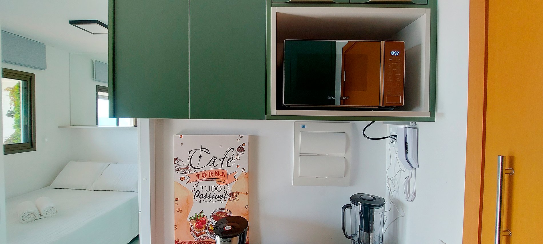 - Complete kitchen with duplex refrigerator, cooktop with 2 burners, water filter, bench with two stools, electric coffee maker, microwave, sandwich maker, blender, airfryer (it is important to keep the wooden board under it when using to avoid heating) and basic household items kitchen.