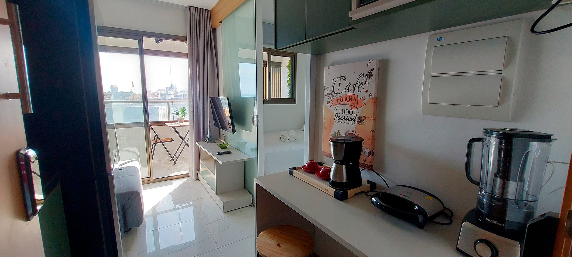 Bedroom and living room with sea view, new and well decorated in Costa Azul! With double bed, smart TV in the living room and bedroom, double sofa bed (see photos of it open before booking), split air conditioning and full kitchen. Condominium with 24-hour concierge, gym, swimming pool and laundry (paid separately).