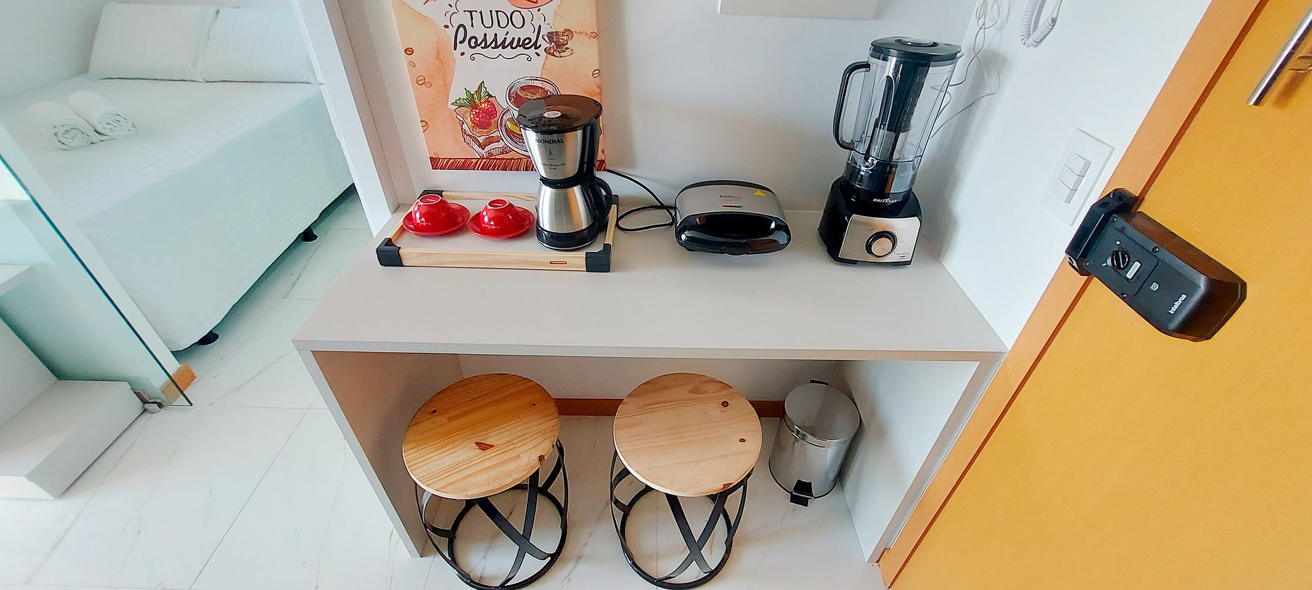 - Complete kitchen with duplex refrigerator, cooktop with 2 burners, water filter, bench with two stools, electric coffee maker, microwave, sandwich maker, blender, airfryer (it is important to keep the wooden board under it when using to avoid heating) and basic household items kitchen.