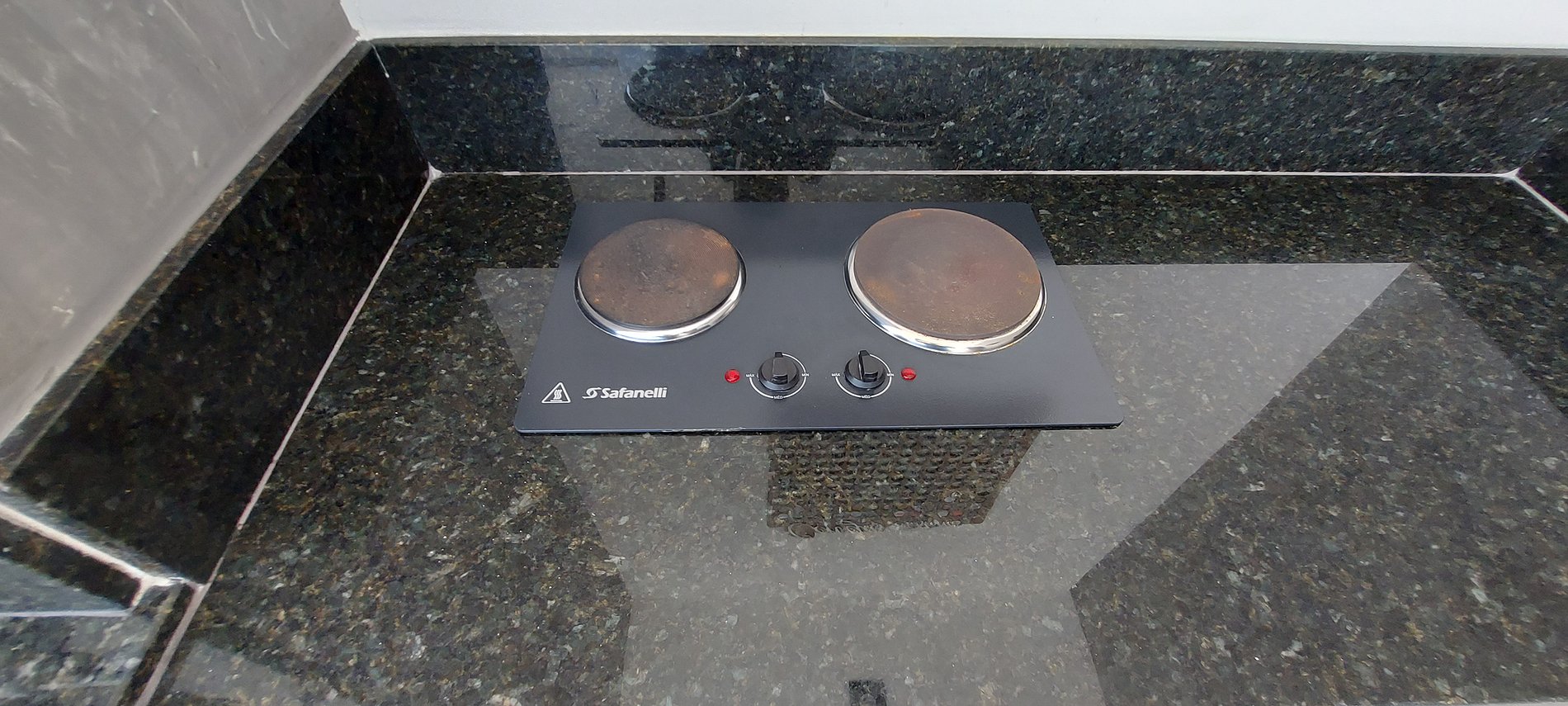 - articulated wooden table, small wooden table, plastic table, plastic chair, fruit bowl, duplex refrigerator, air purifier, 5-burner gas cooktop, blender, airfryer, electric oven, electric coffee maker, sandwich maker, microwave, air filter water, custom cabinets (2 DOORS ARE LOCKED), plastic pots, trays, plates, glasses, mugs, cutlery and kitchen accessories, pans, couscous dish