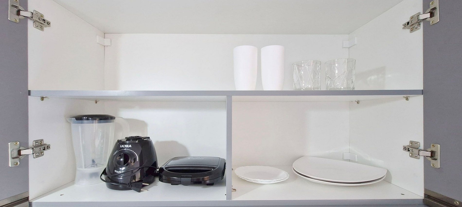 - Kitchen with a sandwich maker, electric coffee maker, refrigerator, mini portable electric stove with two hotplates, a blender, and various kitchen accessories.