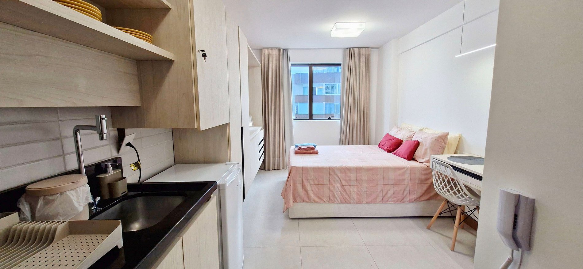 Very near Barra shopping and the Barra-Ondina Carnival! Featuring a double bed and a twin pull-out, smart TV with local channels, Wi-Fi, split air conditioning, and a kitchen. Rooftop with pool, gym, parking, and 24-hour reception. Game room, coworking area. Laundry and minimarket charged separately.