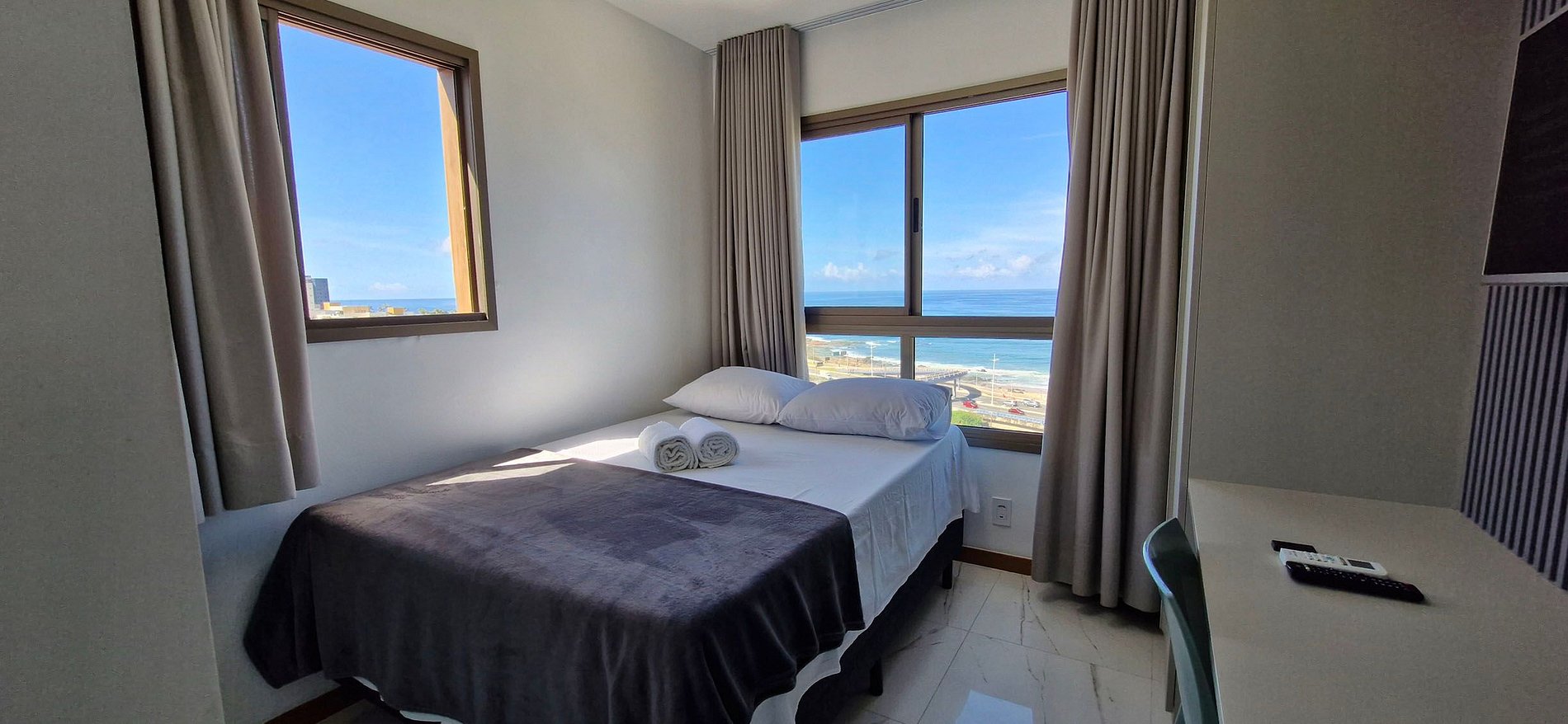 Suite with full sea view, well decorated at Costa Azul! Super ventilated, with double bed, smart TV, split air conditioning and full kitchen. Condominium with 24-hour concierge, gym, swimming pool, co-working and laundry (paid separately).