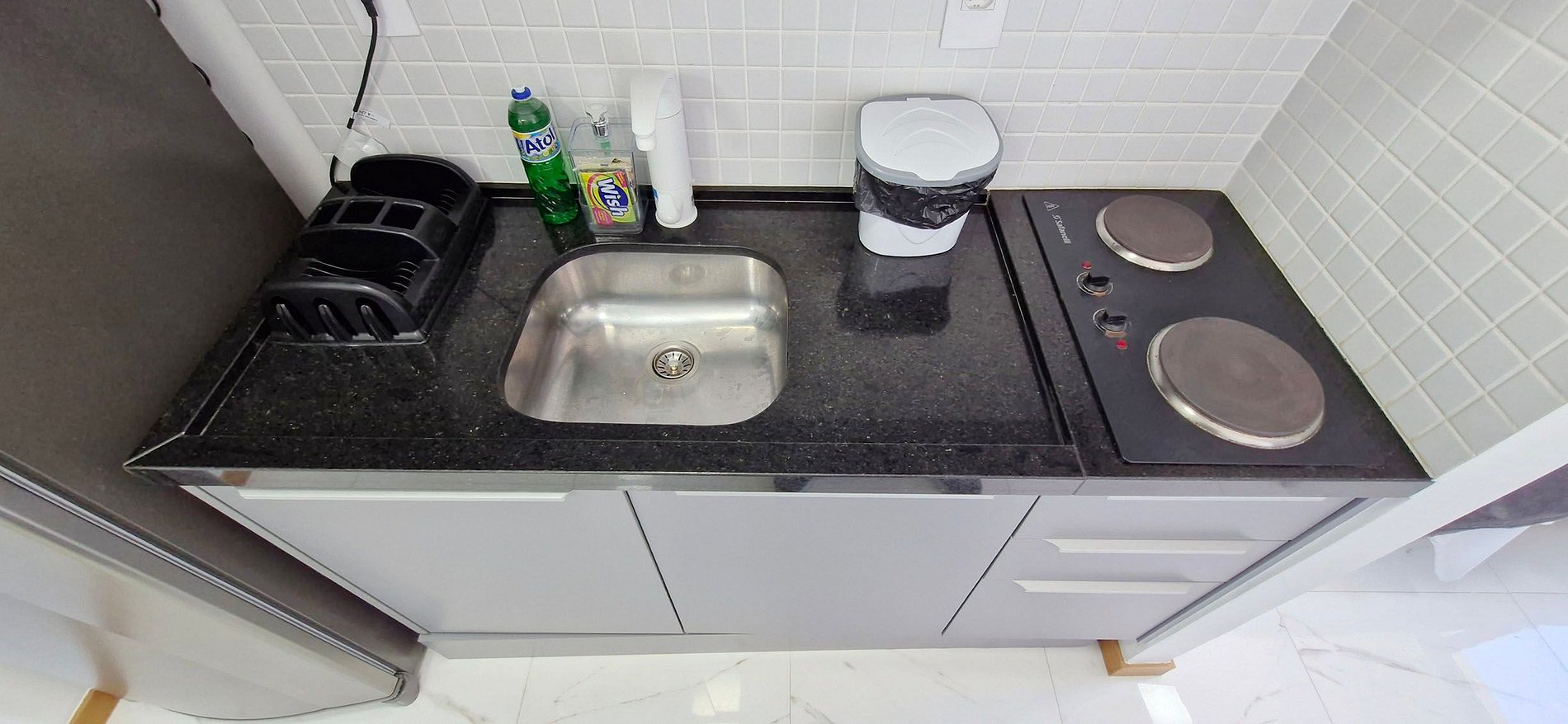 - Complete kitchen with duplex refrigerator, electric cooktop with 2 burners, water filter, countertop with two stools, electric coffee maker, microwave, sandwich maker, blender and basic kitchen items.