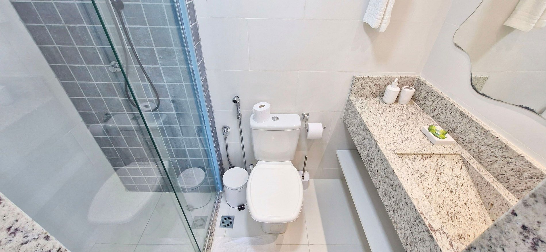 • No solid waste may be flushed down the toilet (including toilet paper). We ask that you use the trash can provided. Otherwise, the toilet may clog and we will charge R$150 to unclog it.