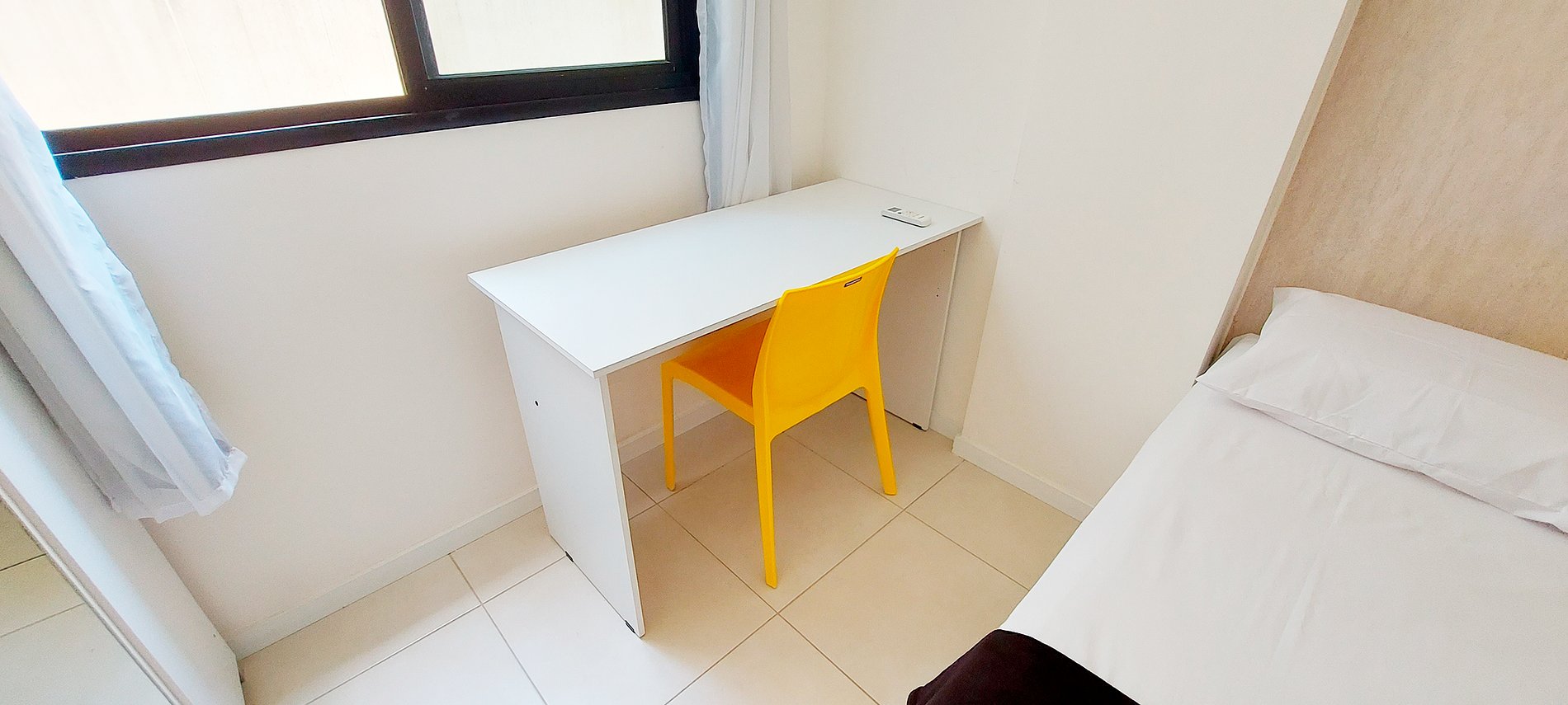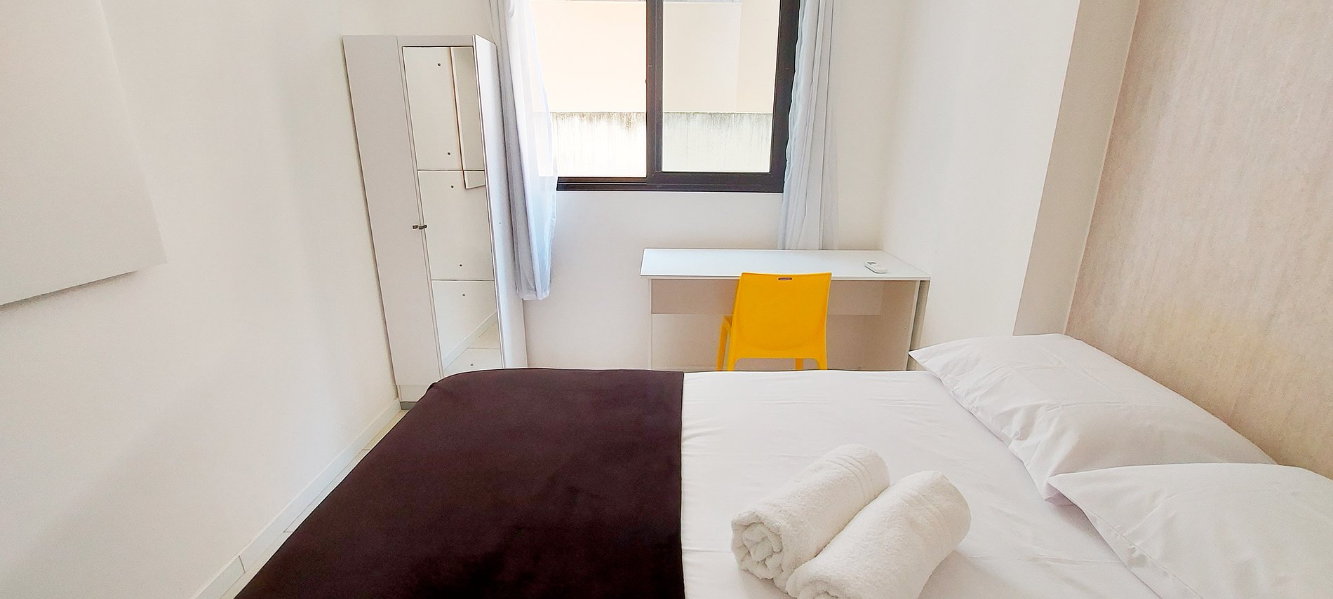 - Bedroom with double bed, wardrobe, split air conditioning, table and armchair for work, panel, iron, blackout curtain