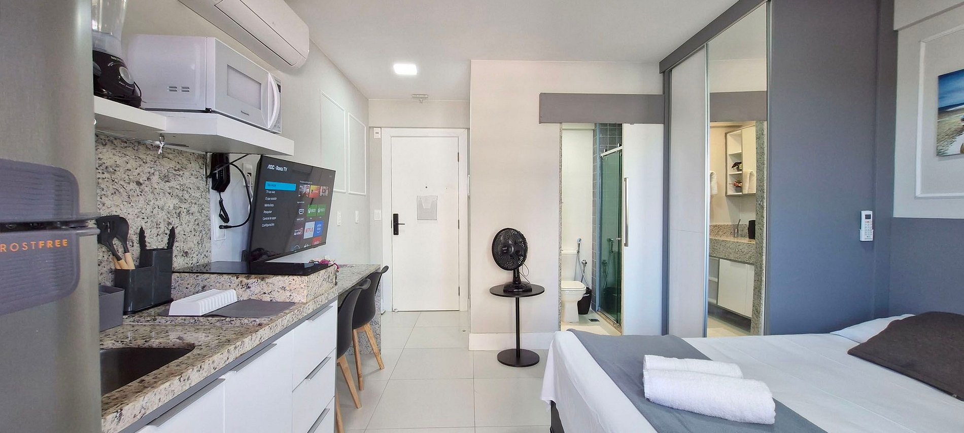 Perfectly located in the Pedra do Sal Privilege Building, close to the famous Itapuã Lighthouse beach, Vinícius de Moraes Square, restaurants, bars, grocery stores, bakery, and pharmacy.