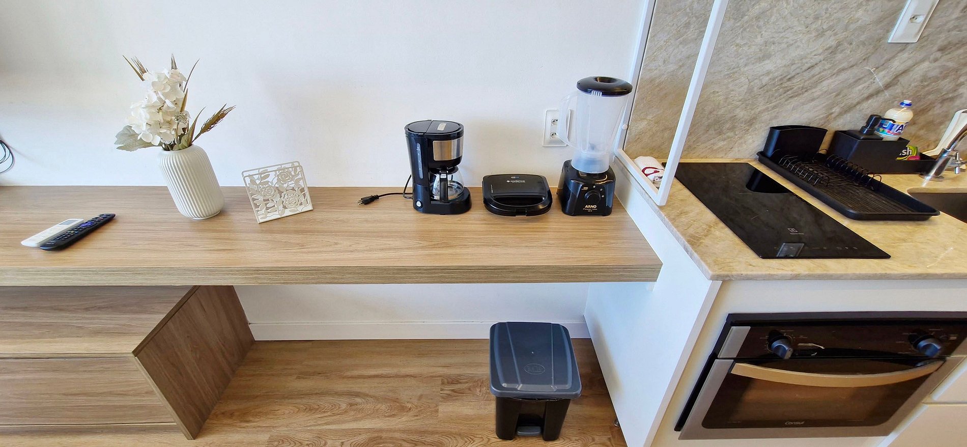 - Kitchen with sandwich maker, electric coffee maker, duplex refrigerator, two-burner induction stove, electric oven, blender and various kitchen accessories