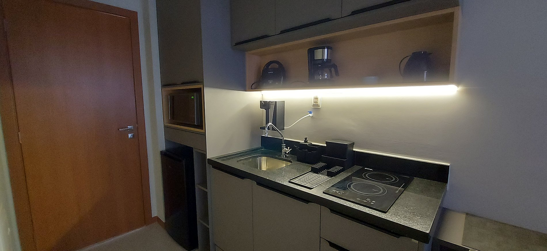 - Kitchen with sandwich maker, electric coffee maker, minibar, water filter, blender, thermos, two-burner induction stove, and various kitchen accessories
