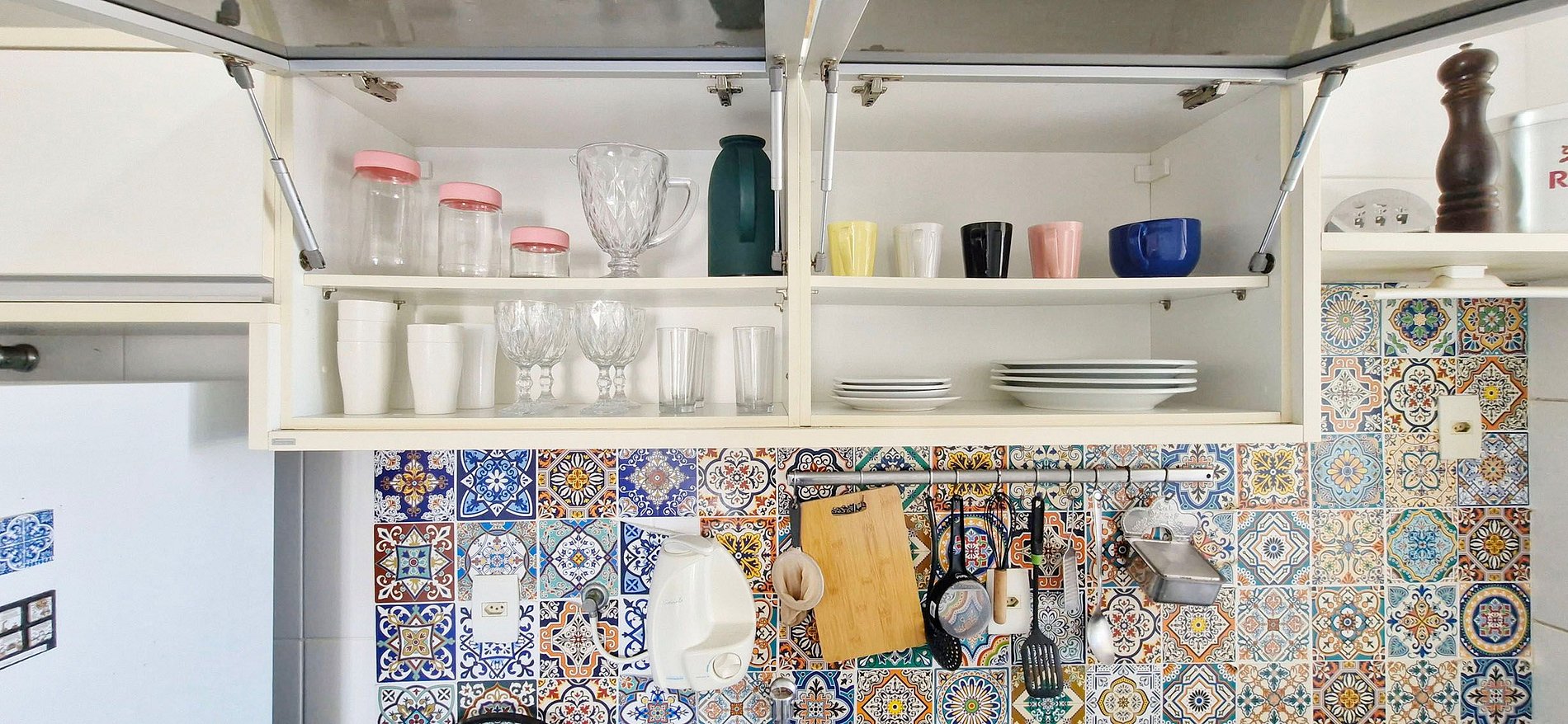 - Double-door refrigerator, 4-burner gas cooktop, sandwich maker, electric coffee maker, thermos, blender, water filter, microwave, cutlery, pots and pans, and various kitchen accessories