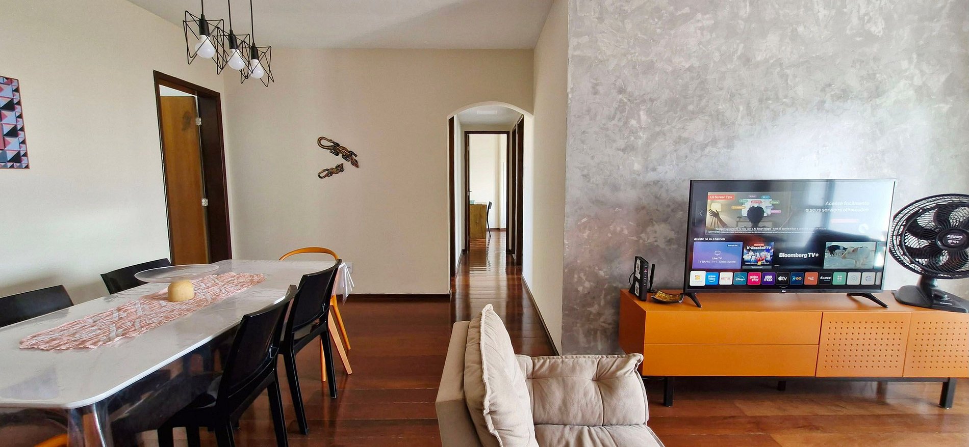 - Living room with 3 seater sofa, 2 armchairs, 2 puffs, rack and SMART TV with Netflix, Prime, table fan