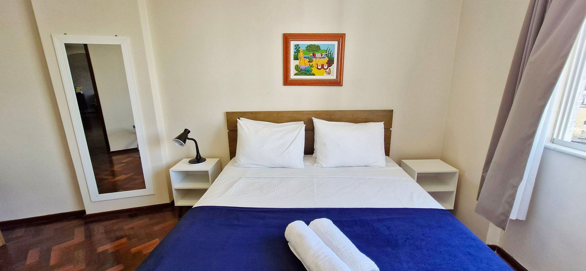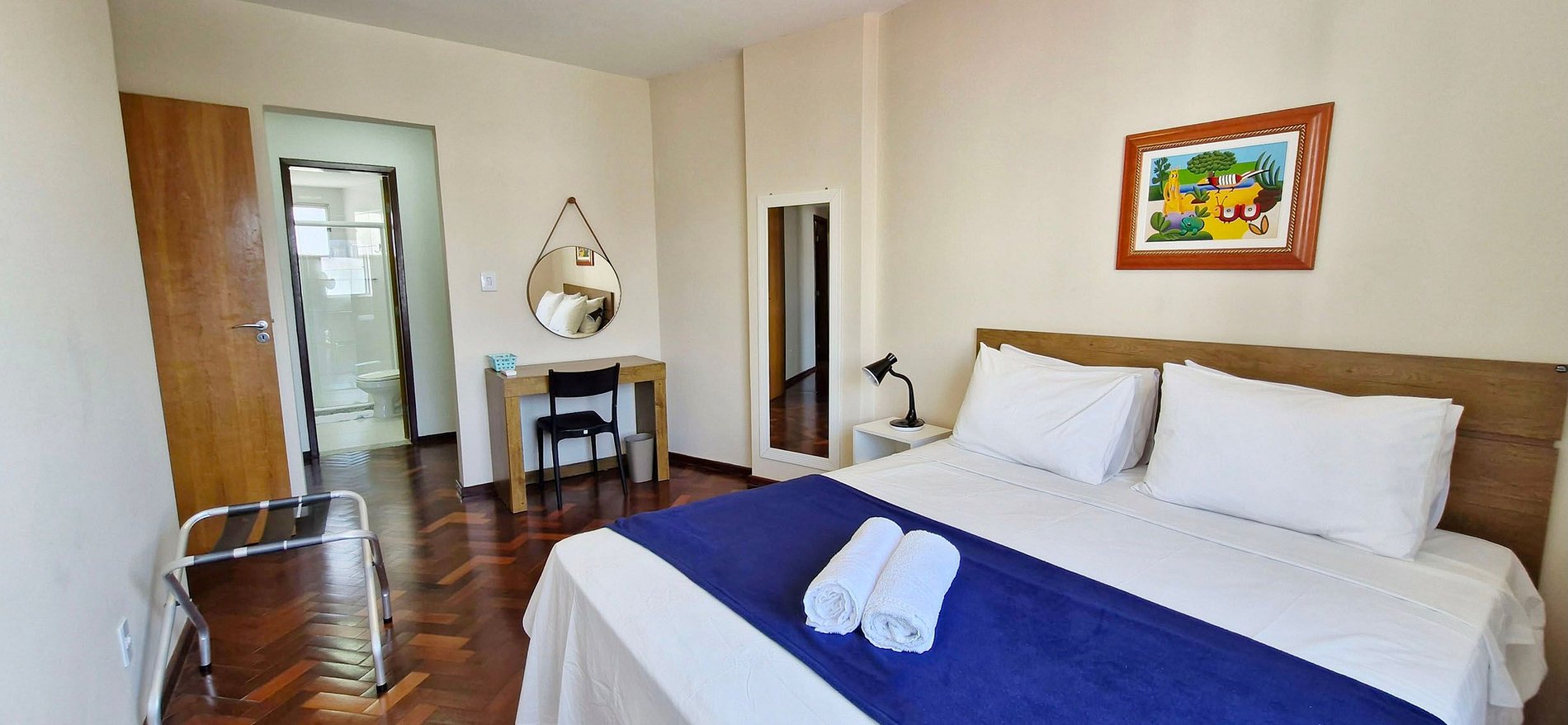 - Suite 1: 1 queen bed, 2 bedside tables, lamp, 1 desk with chair, large mirror, open wardrobe for clothes, blackout curtains, split air conditioning and bathroom with electric shower and hairdryer