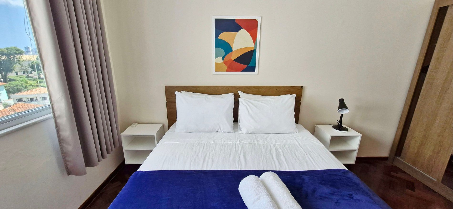 - Bedroom 2: 1 queen bed, 2 bedside tables, lamp, 1 desk with chair, wardrobe, blackout curtain, split air conditioning
