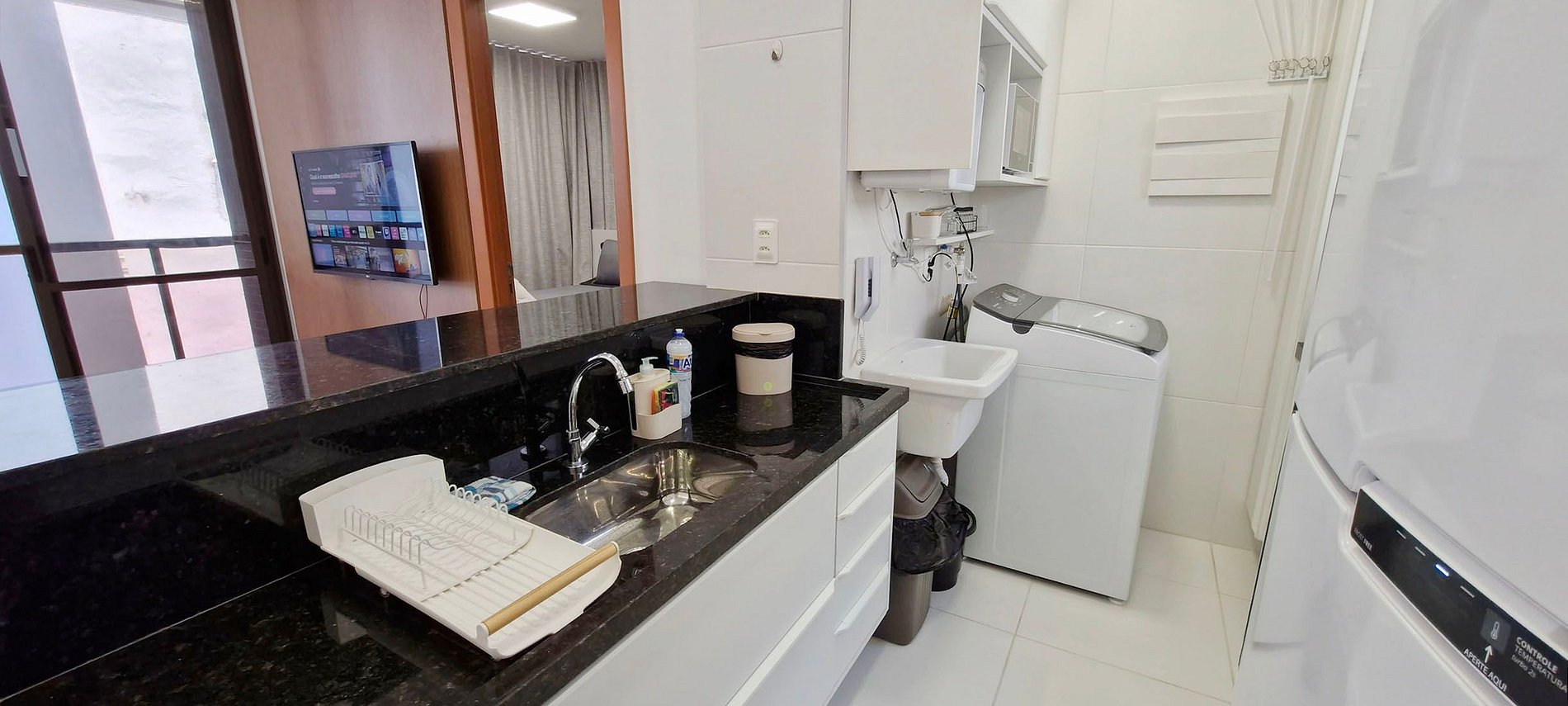 - KITCHEN: countertop with 2 high chairs, sandwich maker, electric coffee maker with capsules, double-door refrigerator, microwave, thermos, blender, air fryer, 2-burner cooktop, pots, pans, containers, glasses, cups and various kitchen accessories. Laundry area with washing machine, sink, and ceiling clothesline.