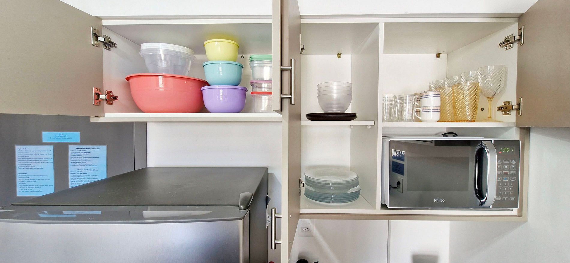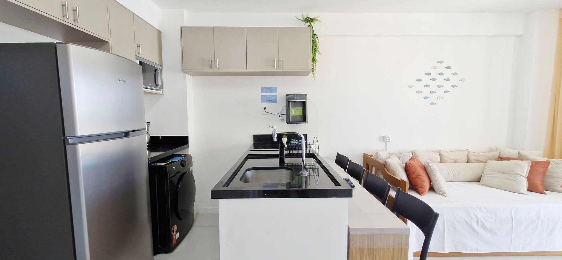 - KITCHEN: sandwich maker, electric coffee maker, double-door refrigerator, blender, microwave, two-burner induction cooktop, electric oven, water filter, pots, pans, cutlery, glasses, and various kitchen accessories. Washing machine (washer and dryer).