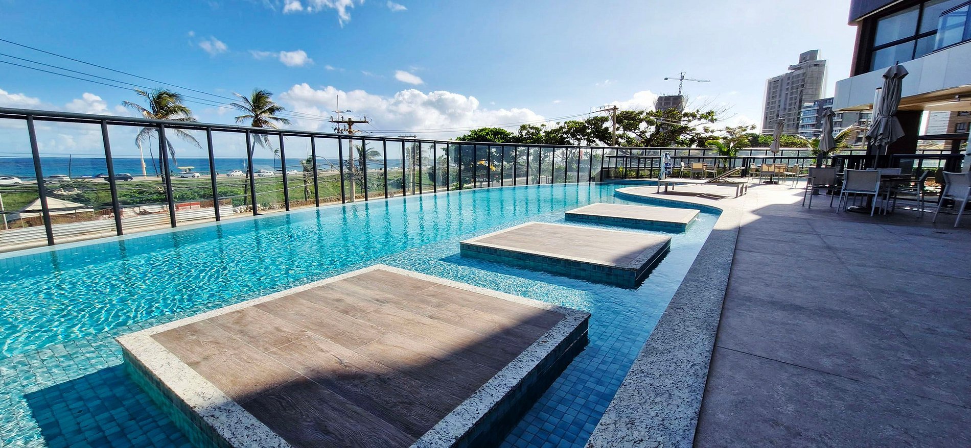 One-bedroom apartment in a beachfront building overlooking Jaguaribe beach. The building has an outdoor pool with ocean views, an air-conditioned gym, a children's playground, a coworking space, and parking. Supermarket and McDonald's are next door.
