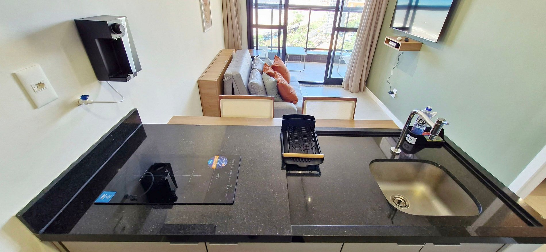 - KITCHEN: sandwich maker, electric coffee maker, kettle, double-door refrigerator, blender, microwave, two-burner induction cooktop, range hood, water filter, pots, pans, cutlery, glasses, and various kitchen accessories.