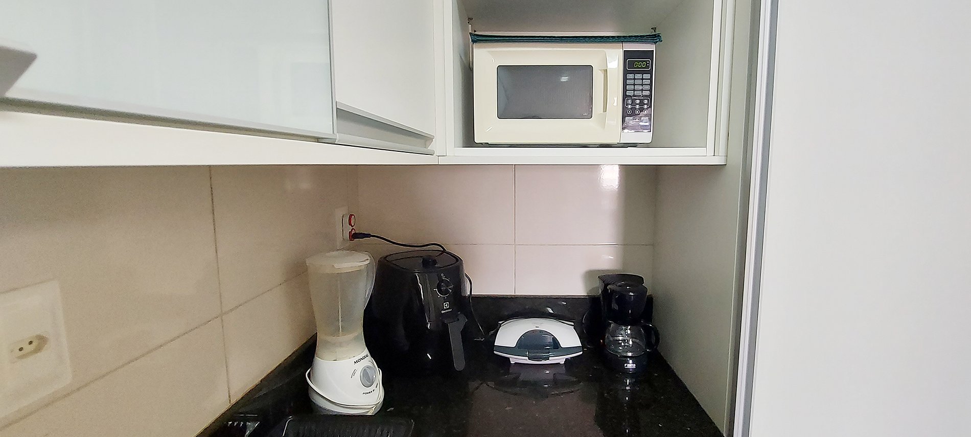 - Intercom, duplex refrigerator, 4-burner stove, microwave, water filter, blender, airfryer, electric coffee maker, Italian coffee maker, couscous maker, sandwich maker, mixer, kettle, pressure cooker, table with 4 chairs, fruit bowl and various kitchen accessories