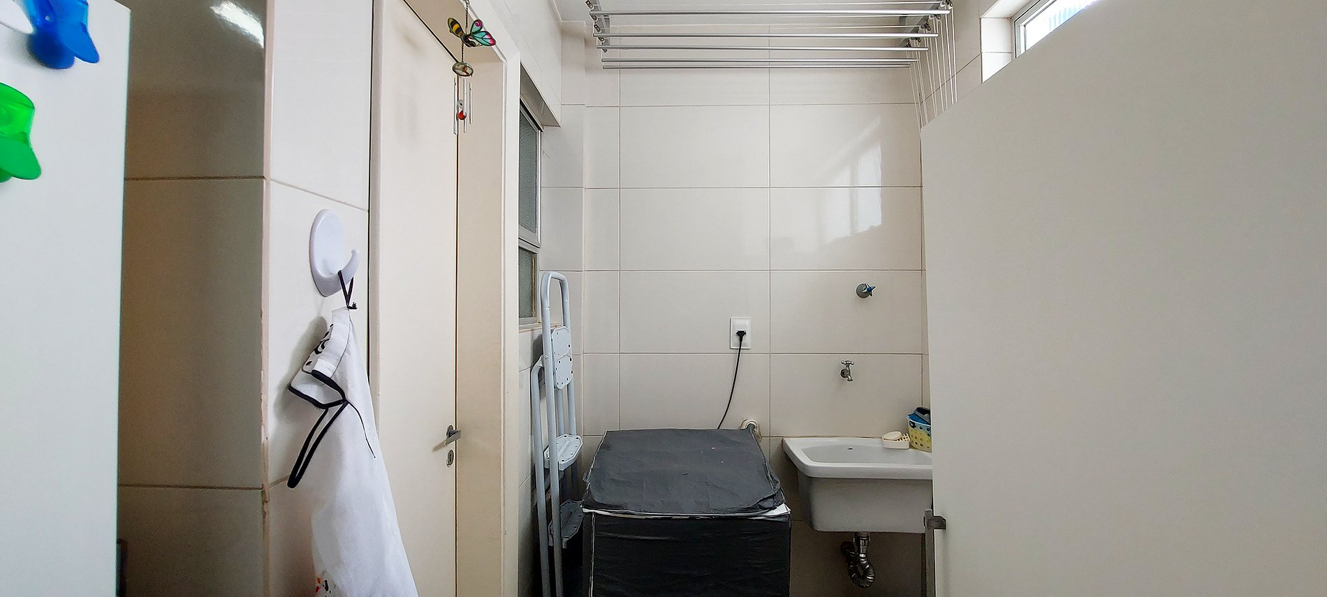 - Washing machine, ceiling clothesline and standing clothesline, stepladder, sink, closet