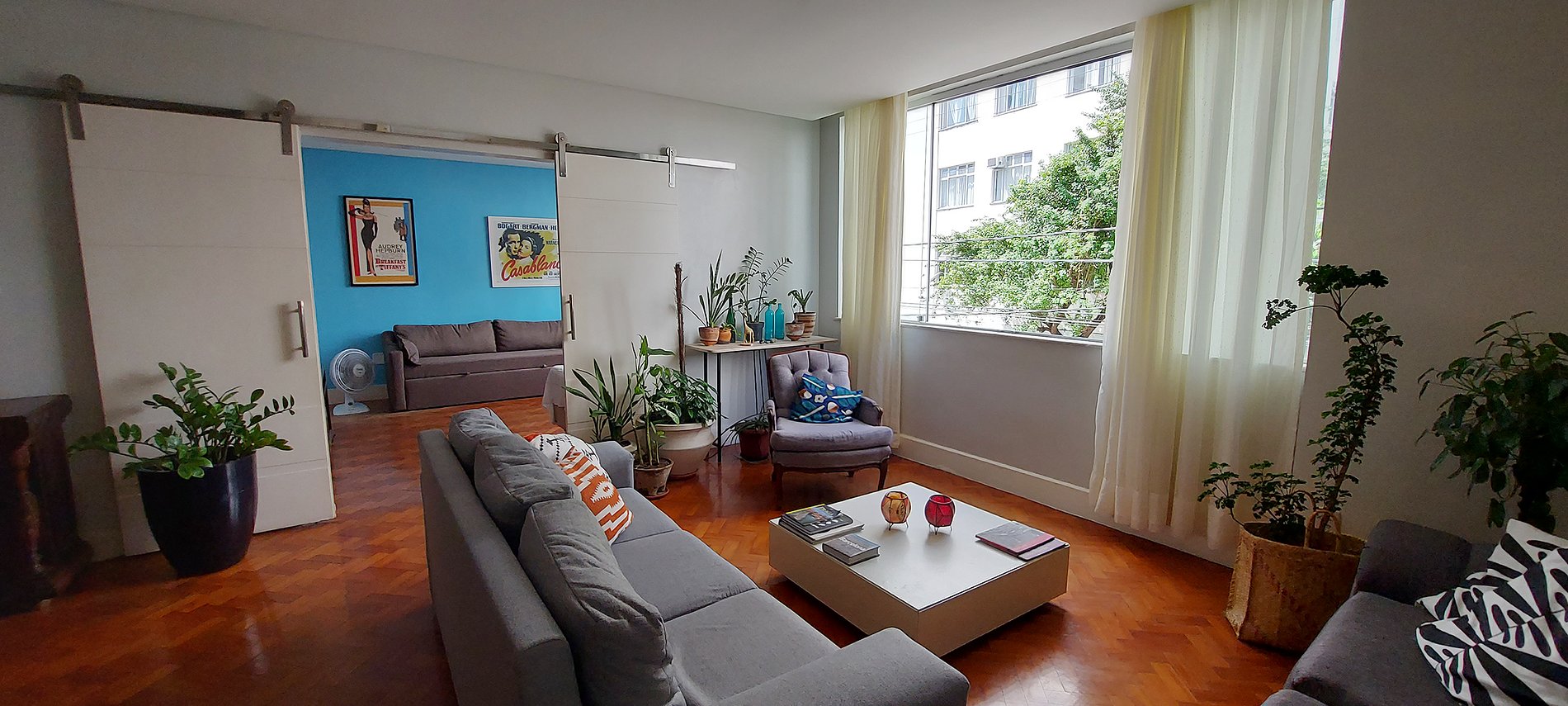 - Double sofa bed, single bed, wooden rack with panel and smart TV (tunes local channels), blue round coffee table, ceiling fan, table fan, blackout curtain