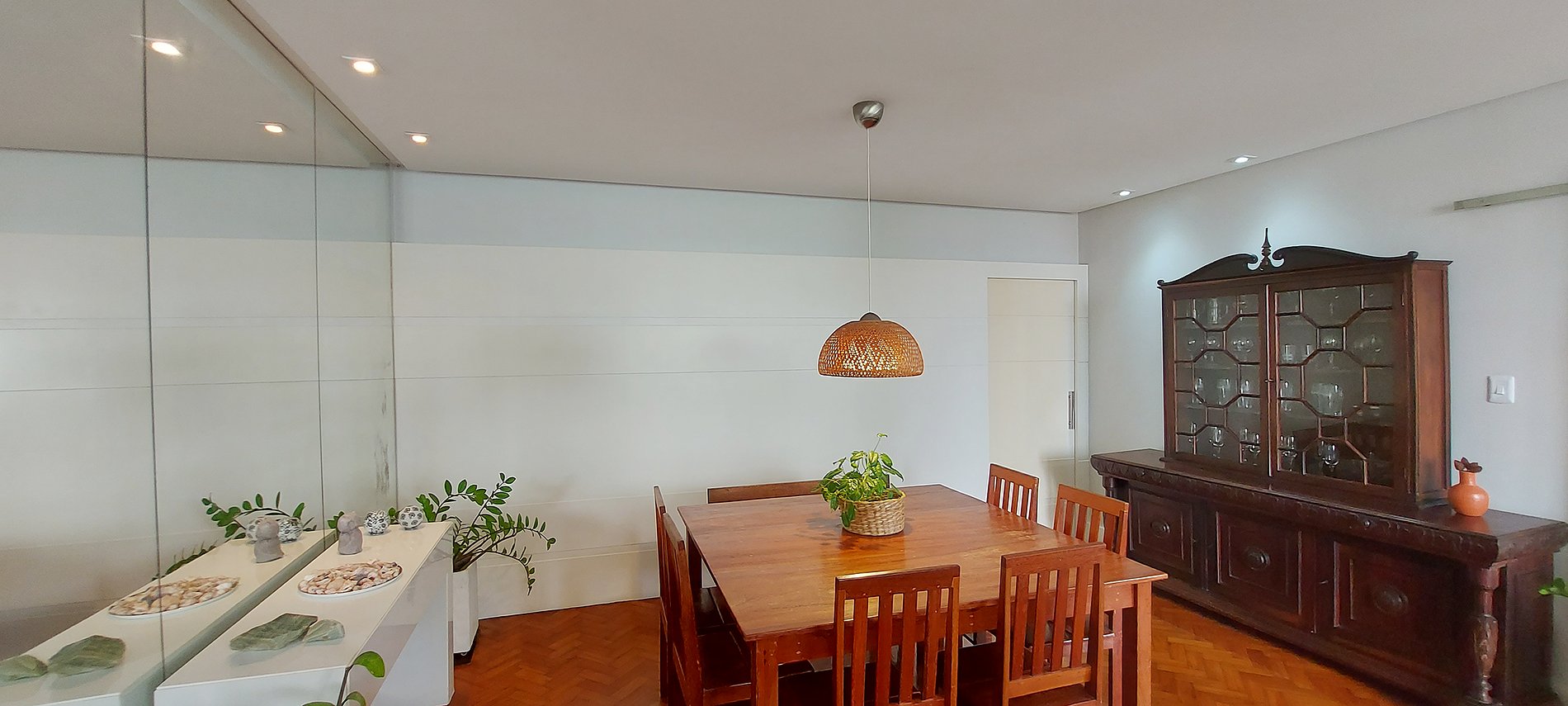 - Dining room with wooden table, 6 chairs, 1 bench for 2 seats, large mirror, cupboard with glasses and glasses