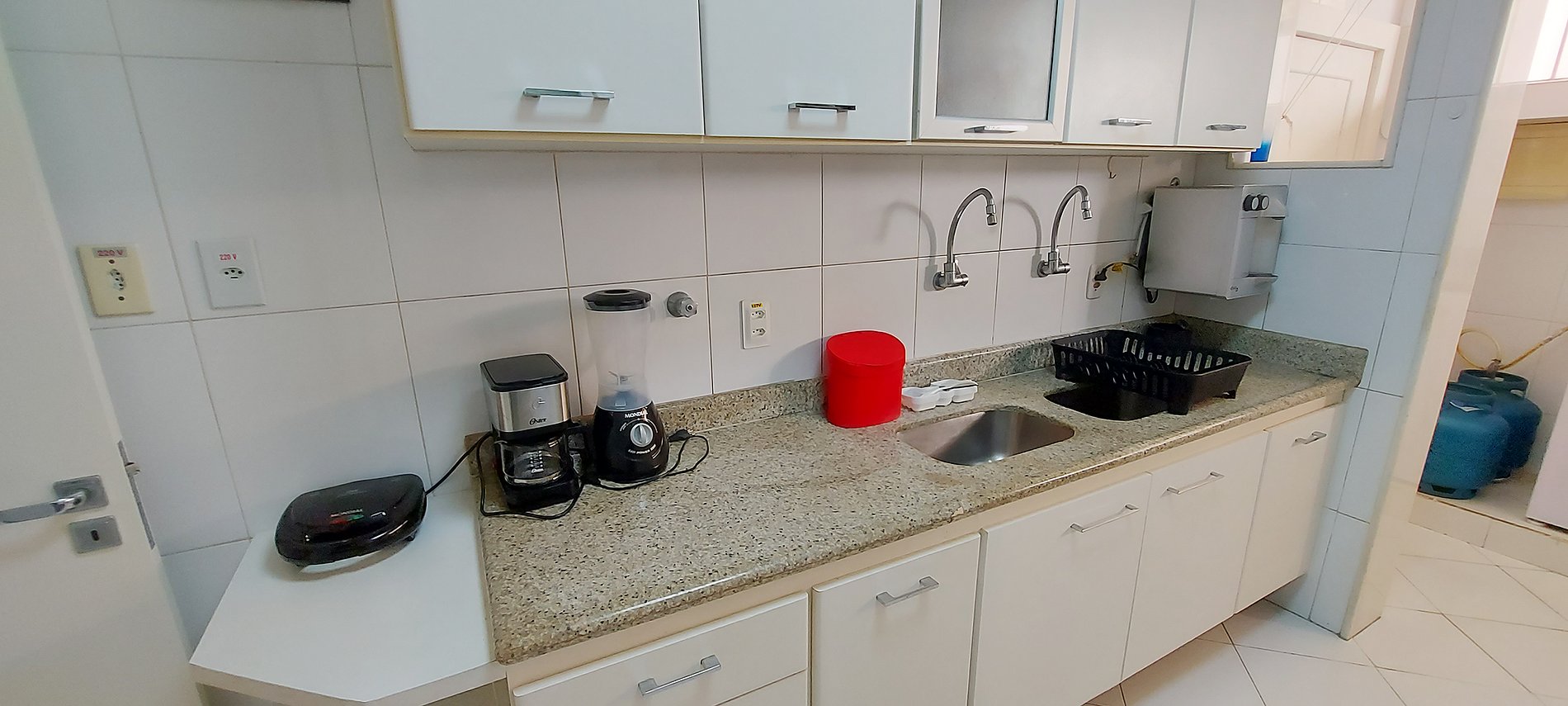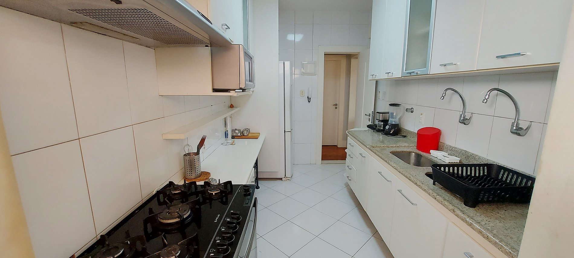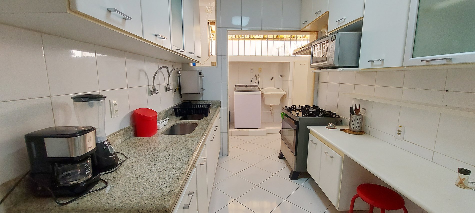 - Inverter refrigerator, 5-burner gas stove, sandwich maker, electric coffee maker, microwave, blender, water filter, double sink, 2 red stools, air purifier, pans, basic items and kitchen accessories