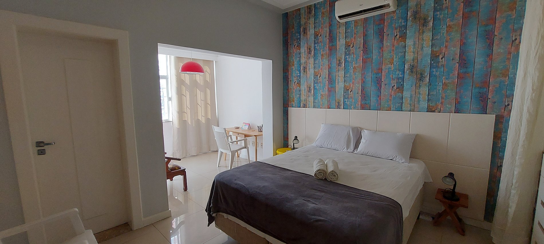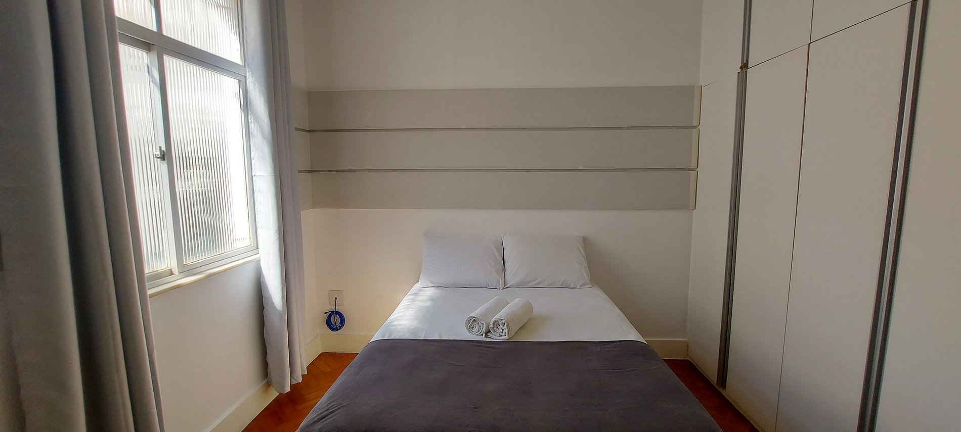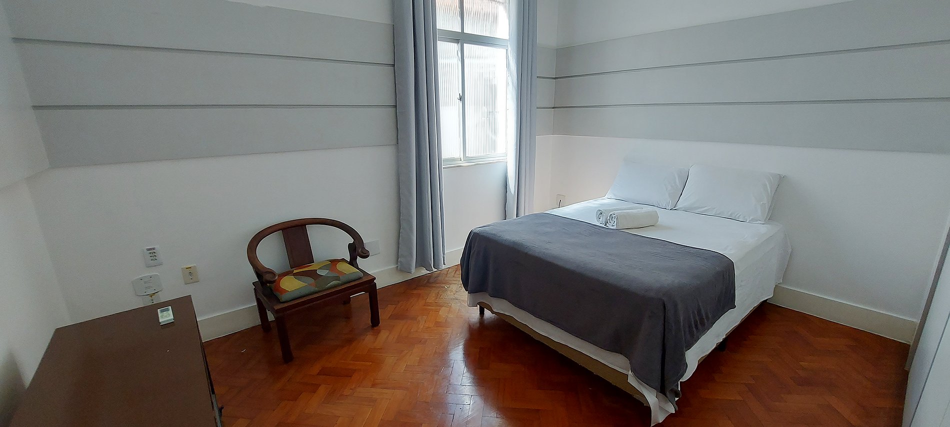 - Double bed, blackout curtain, wardrobe (the top part is locked and is not for guest use), wooden chair, wooden rack, split air conditioning