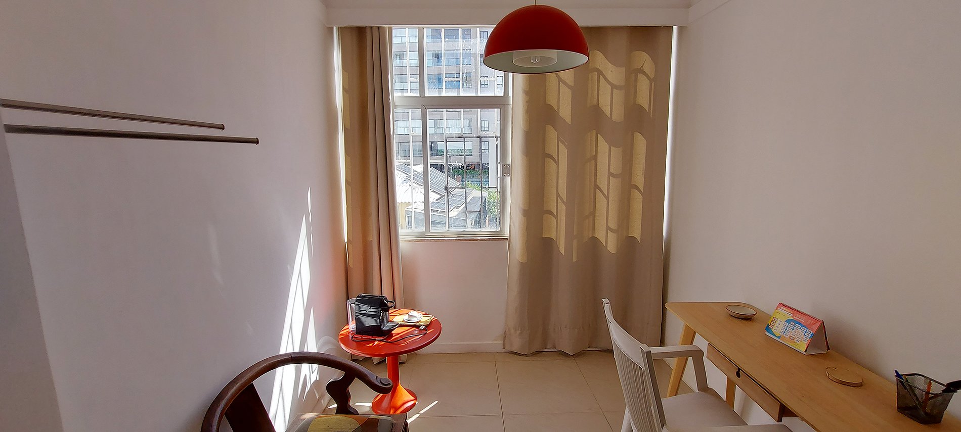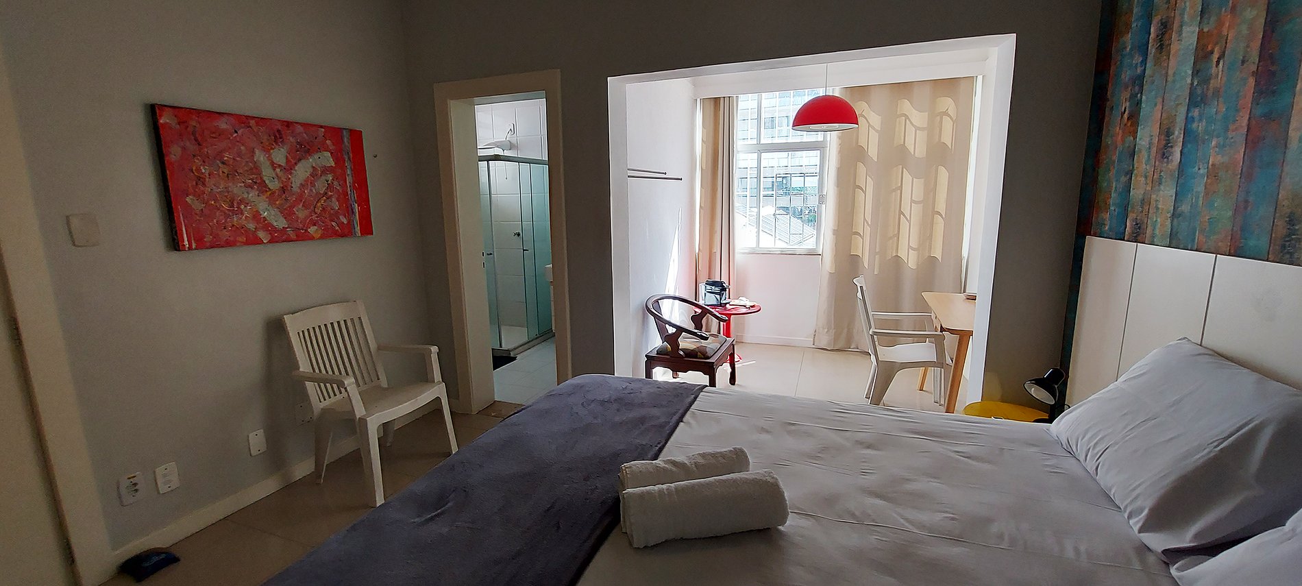 - Queen bed, split air conditioning, large wardrobe, 2 plastic chairs, 1 wooden chair, 2 wooden bedside tables with lamp, iron, work table, small red round table with Nespresso capsule coffee maker (bring your own capsule of your choice), blackout curtain, bathroom with glass shower, sink with cabinet, mirror and electric shower.