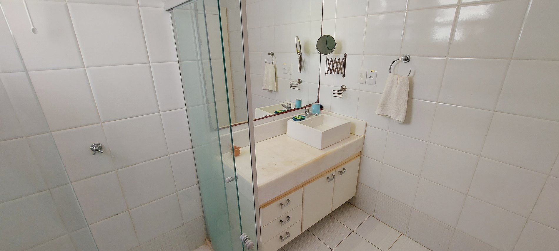 - Glass shower, sink with cabinet, mirror, electric shower, large closet