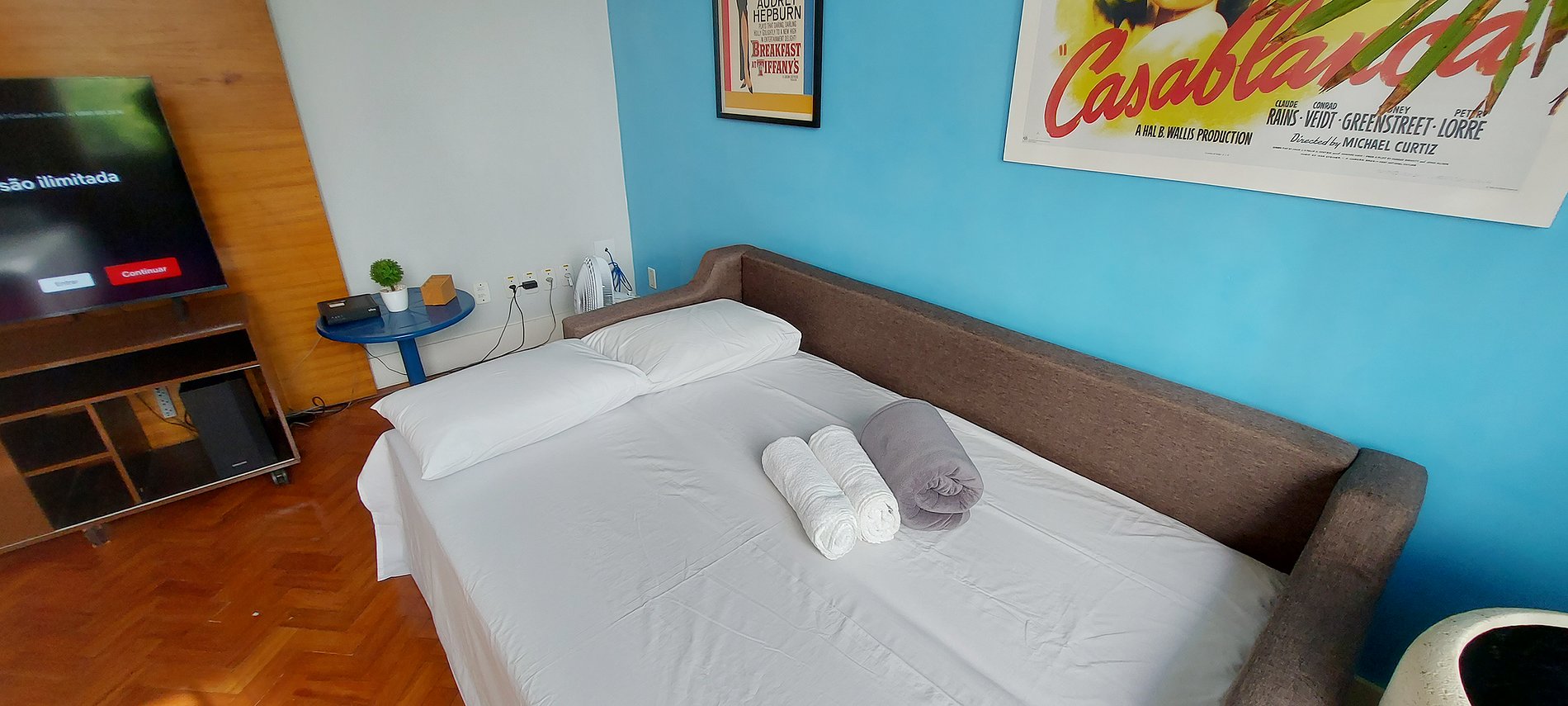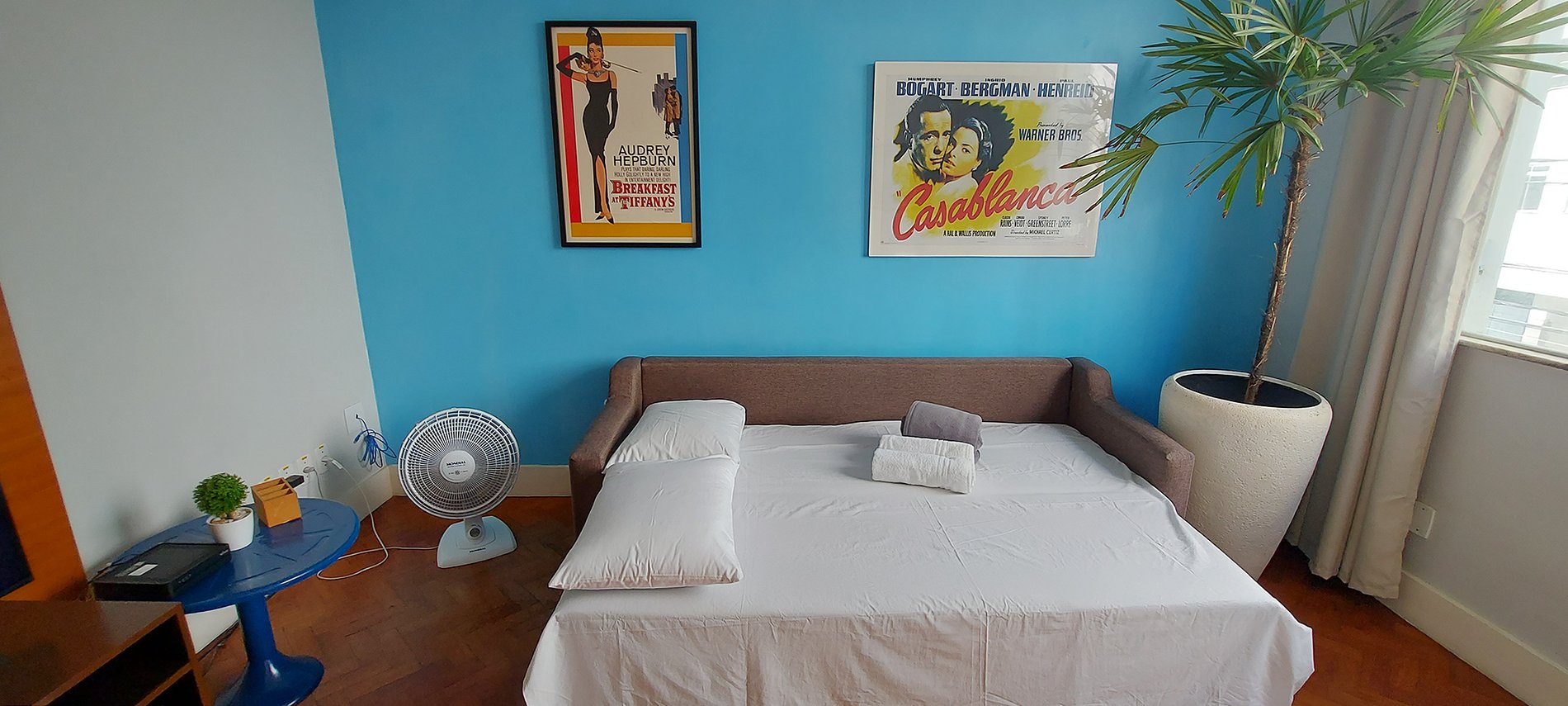 - Double sofa bed, single bed, wooden rack with panel and smart TV (tunes local channels), blue round coffee table, ceiling fan, table fan, blackout curtain