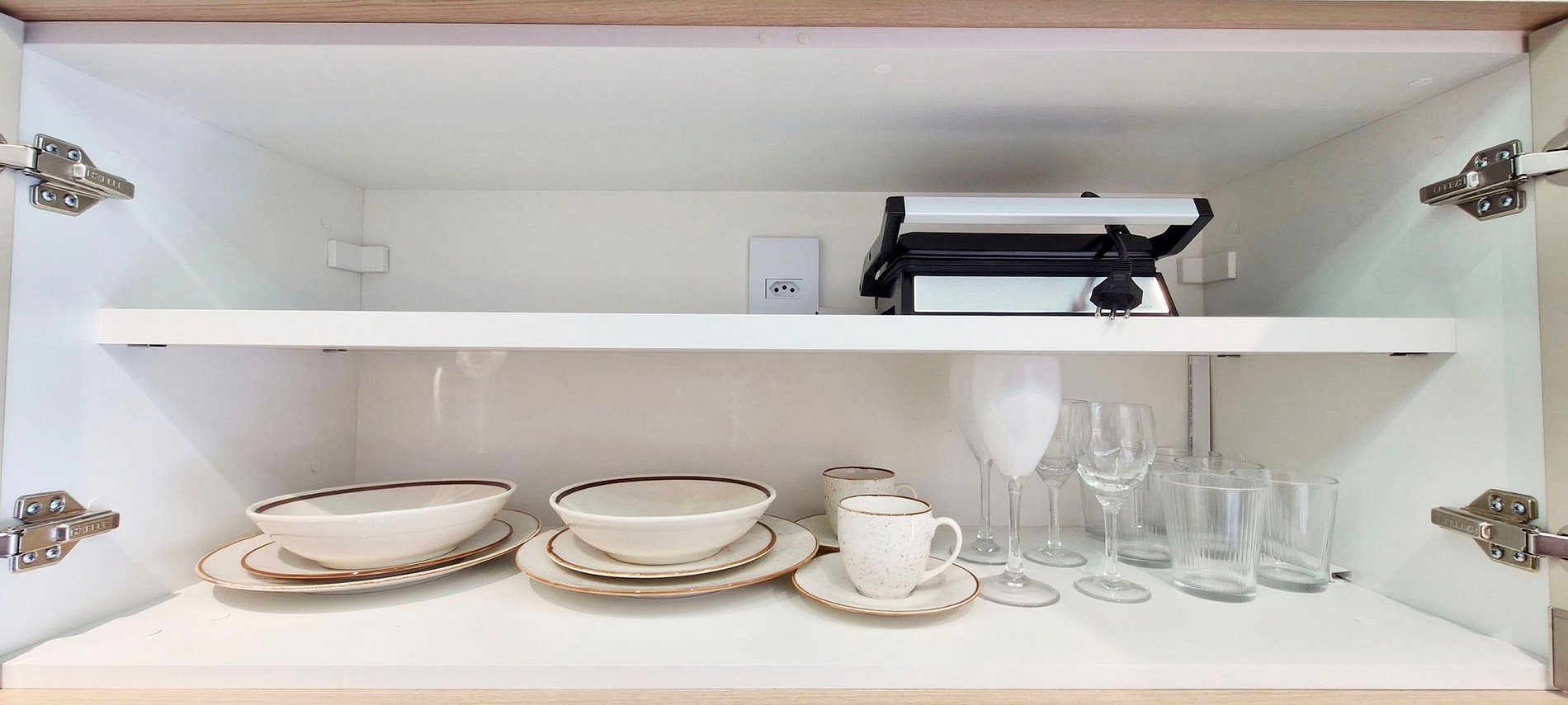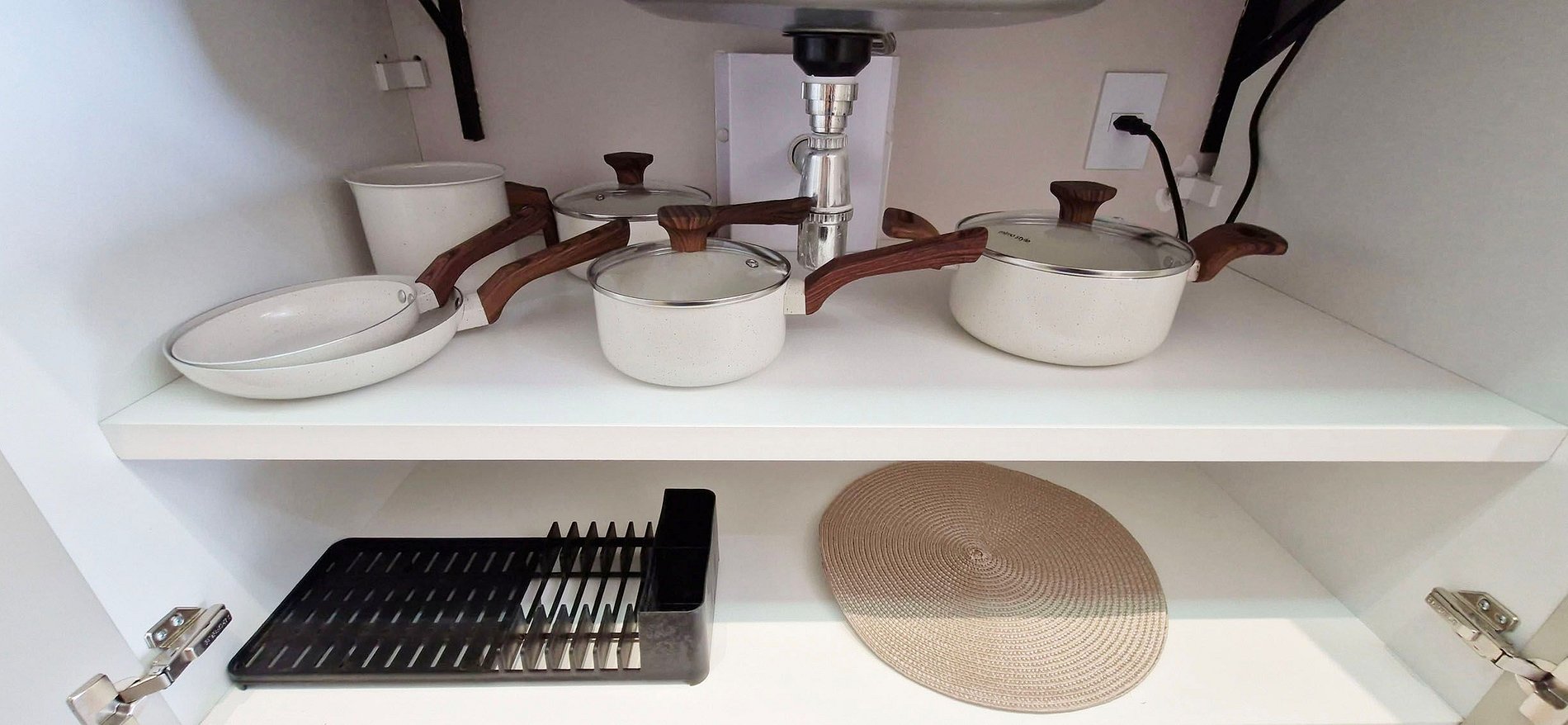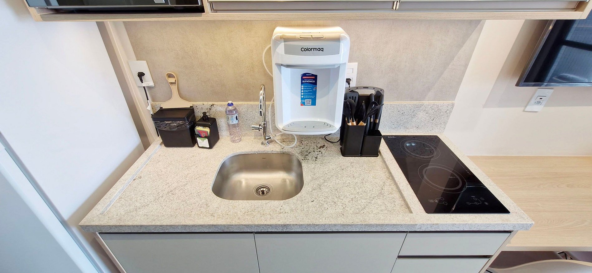 - Double-door fridge, microwave, two-burner induction cooktop, water filter, sandwich maker, electric kettle, blender, basic pots and pans, glasses, wine glasses, plates, and assorted kitchen accessories. Iron and bucket.