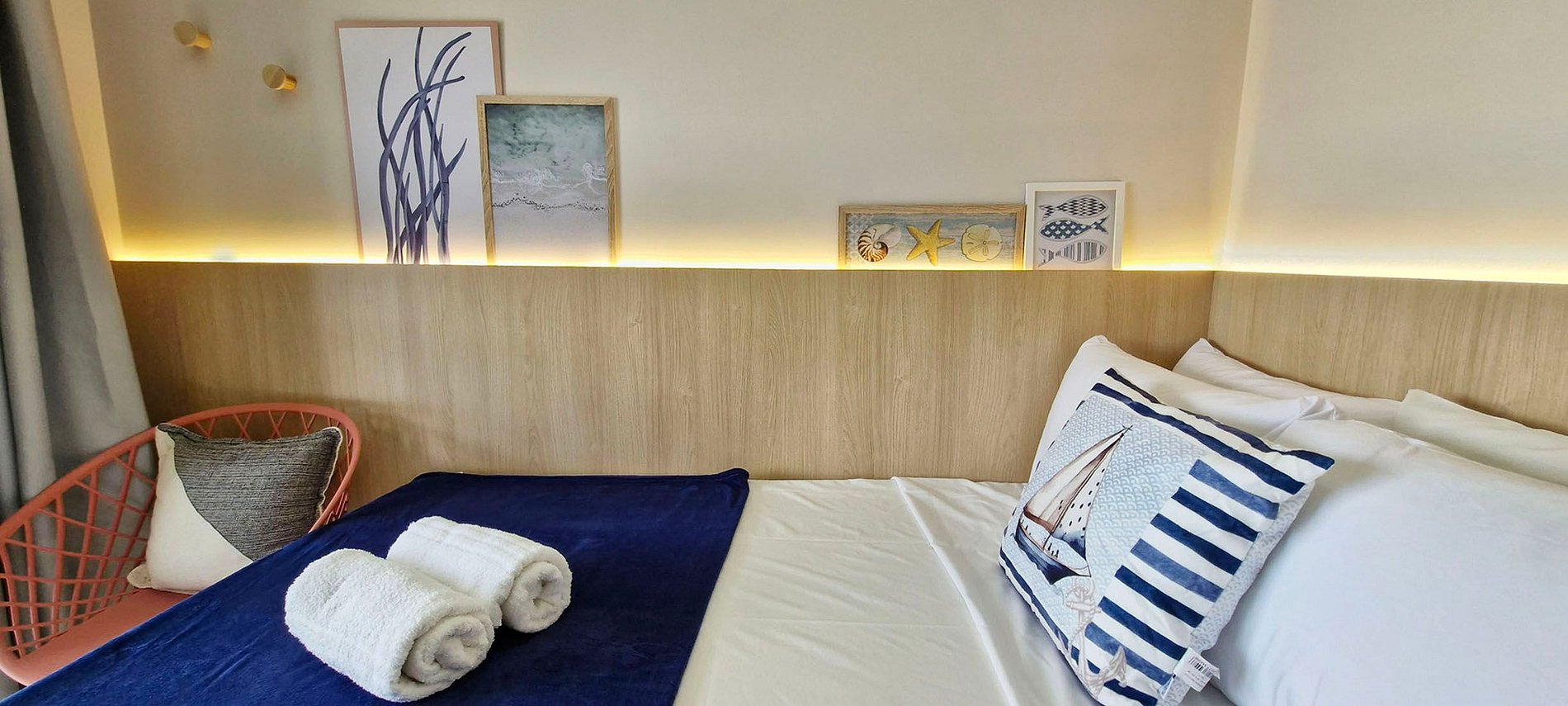 - Double bed, split air conditioning, smart TV with apps, curtains, LED lights beside the bed, 1 chair, wardrobe with hangers, work desk with 2 chairs.
