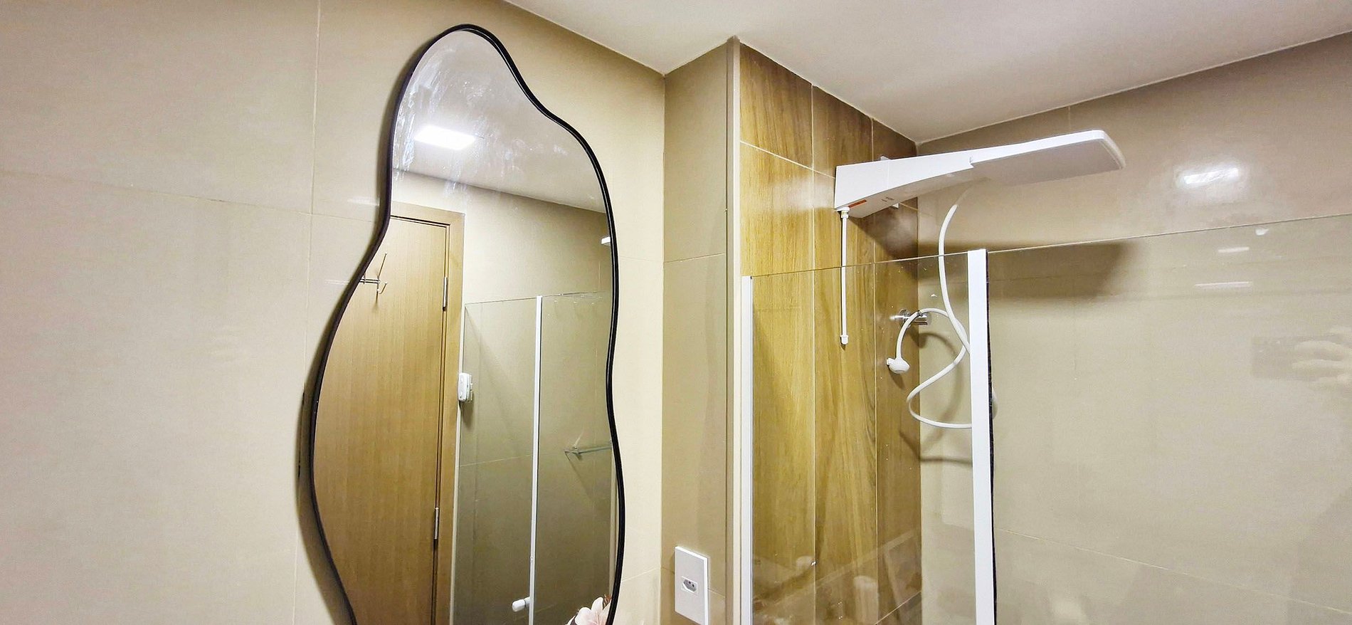 - Bathroom with cabinet, hair dryer, mirror, shower stall, and electric shower.