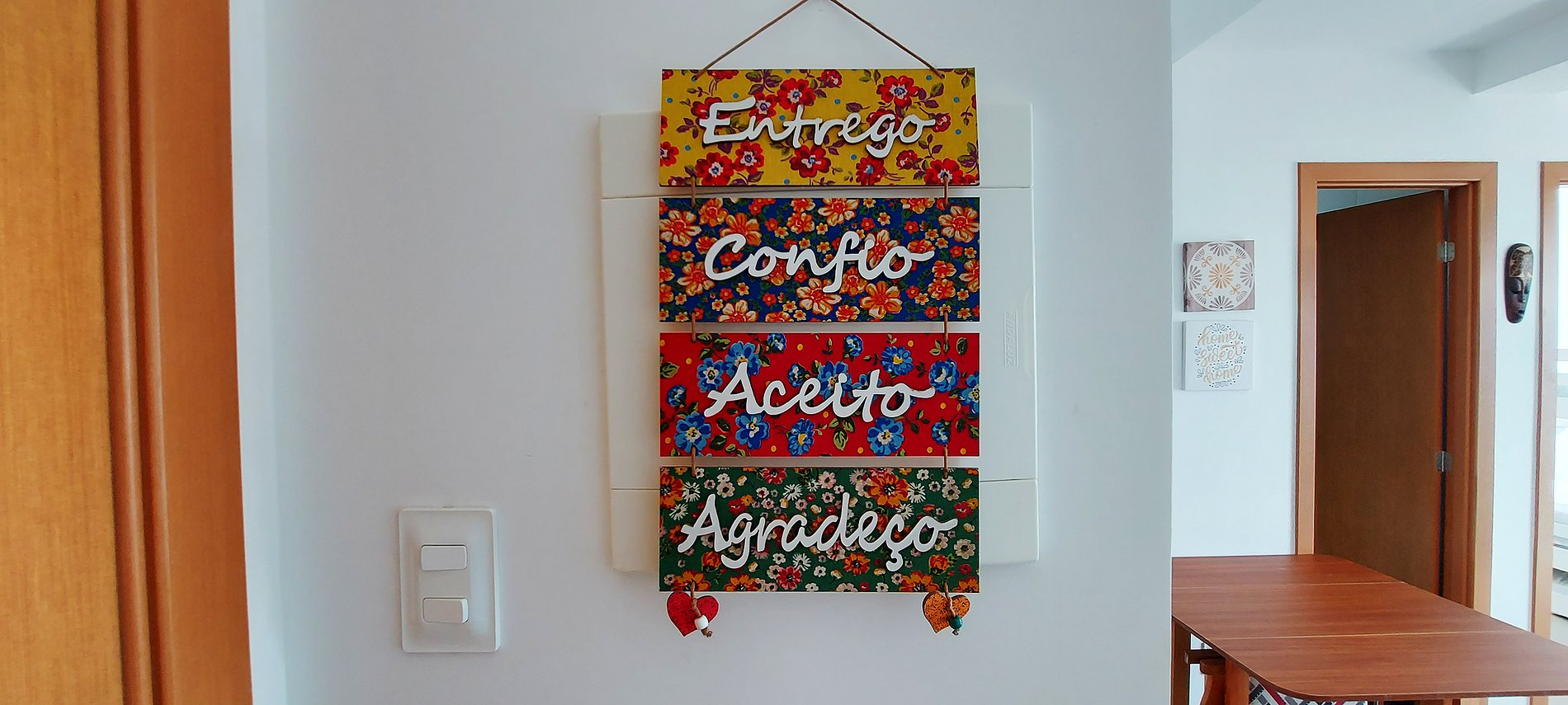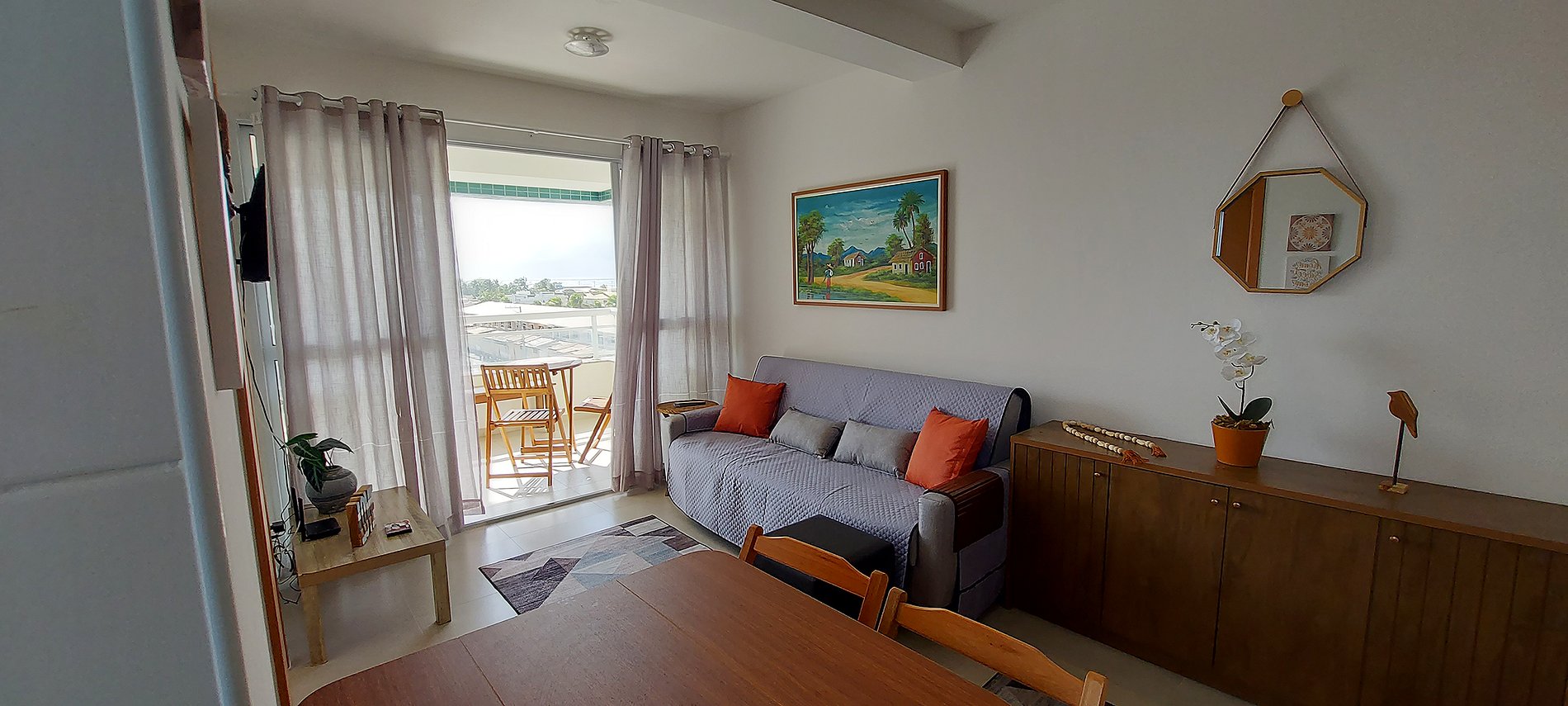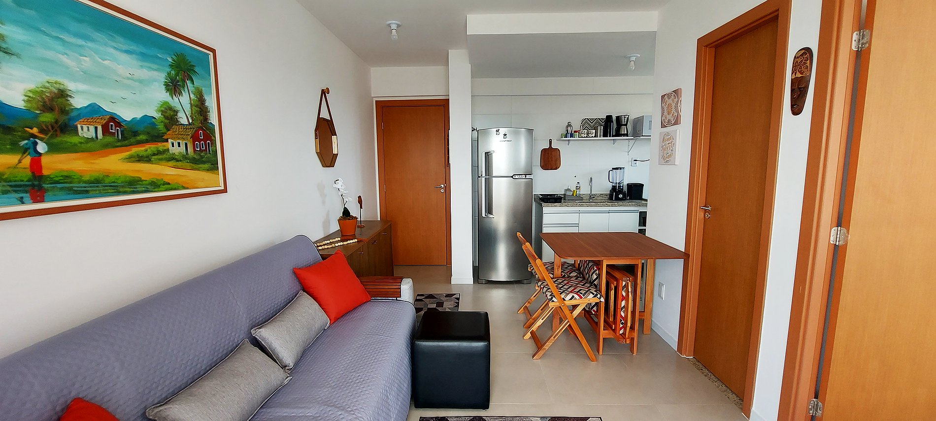 - Wooden rack with kitchen utensils and decorative items, square wooden table with 4 chairs, 2-seater sofa with protective cover and cushions, rug, black square pouf, mirror, wooden coffee table, WI-FI, smart TV with local channels, thin curtain, decorative frames