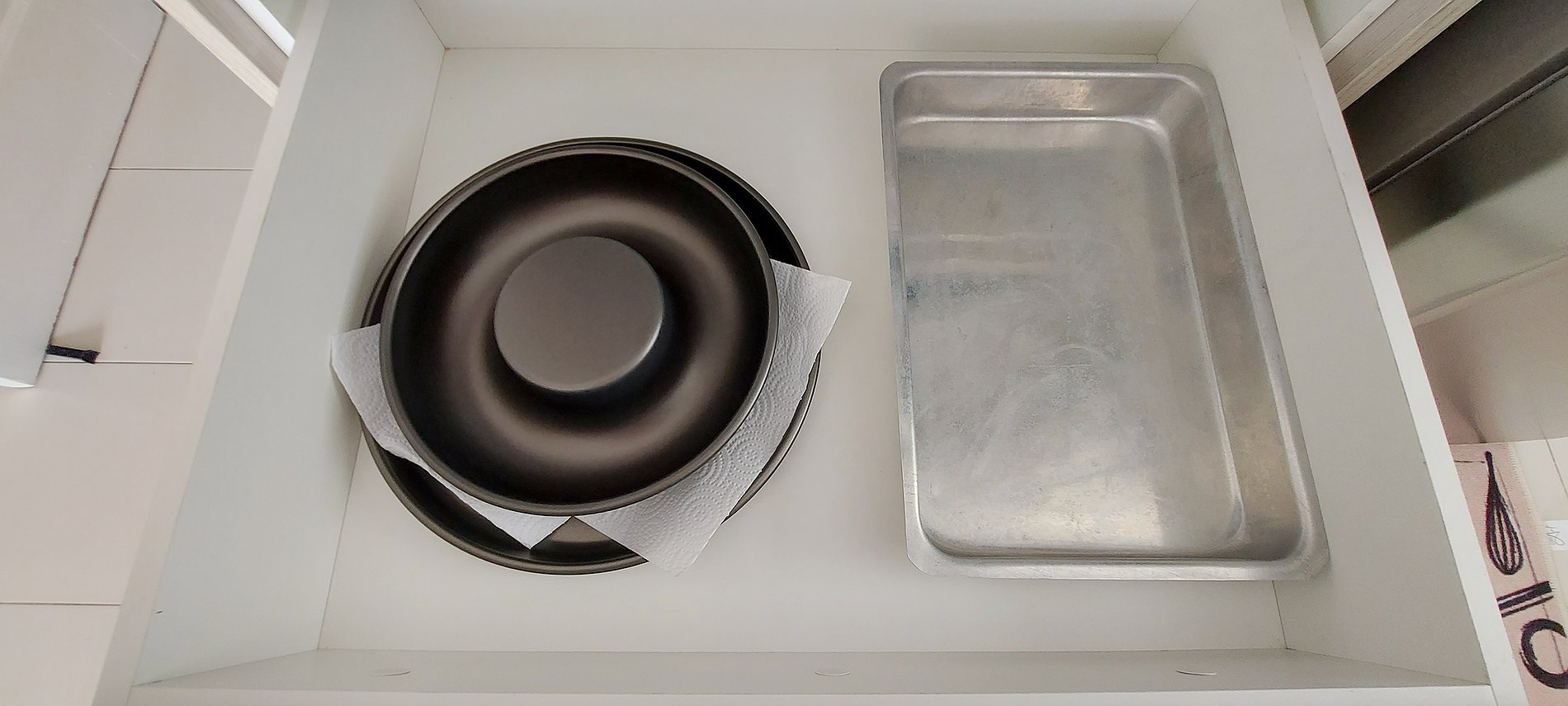 - wooden cutting board, glasses, bowls, cups, various pans, pressure cooker, couscous pan, cake pan, cutlery and basic kitchen accessories