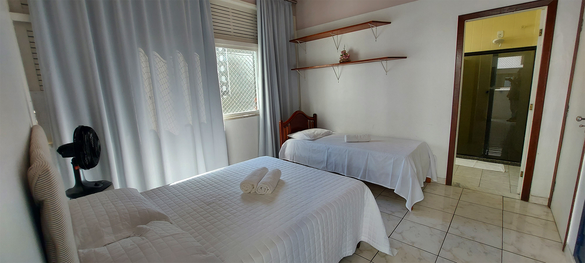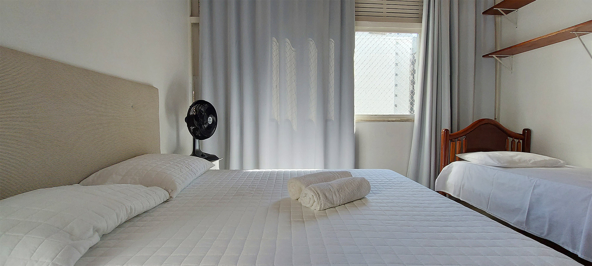 - Bedroom 1: Three single beds, blackout curtain, table fan, large wardrobe and decorative frames