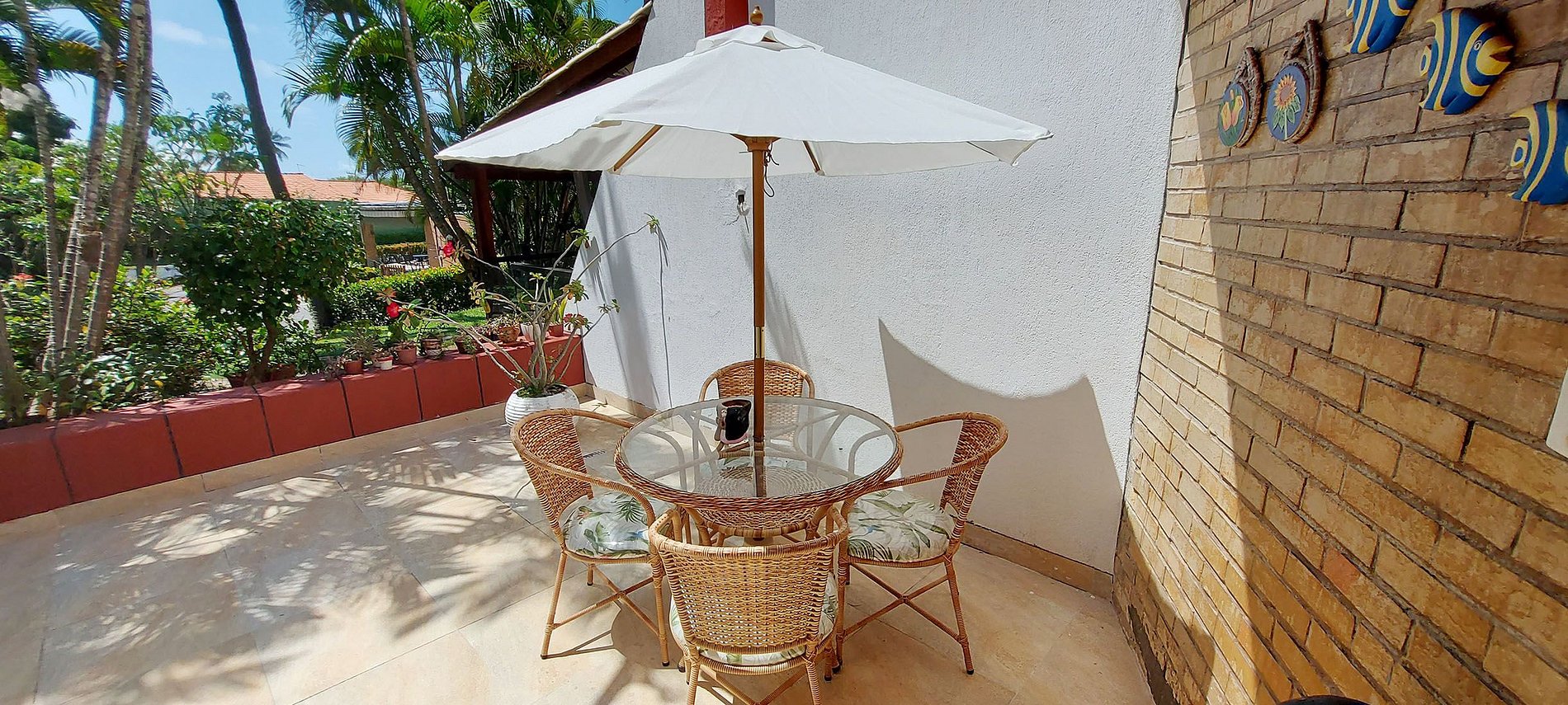 - Round table with glass top, parasol and 4 wicker chairs