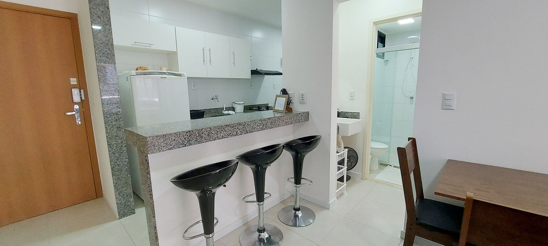 - Living room with double sofa bed, smart TV panel with local channels, high-speed WI-FI, table fan, split air conditioning, curtains, wooden table with 4 chairs, round side table, 3 high black stools