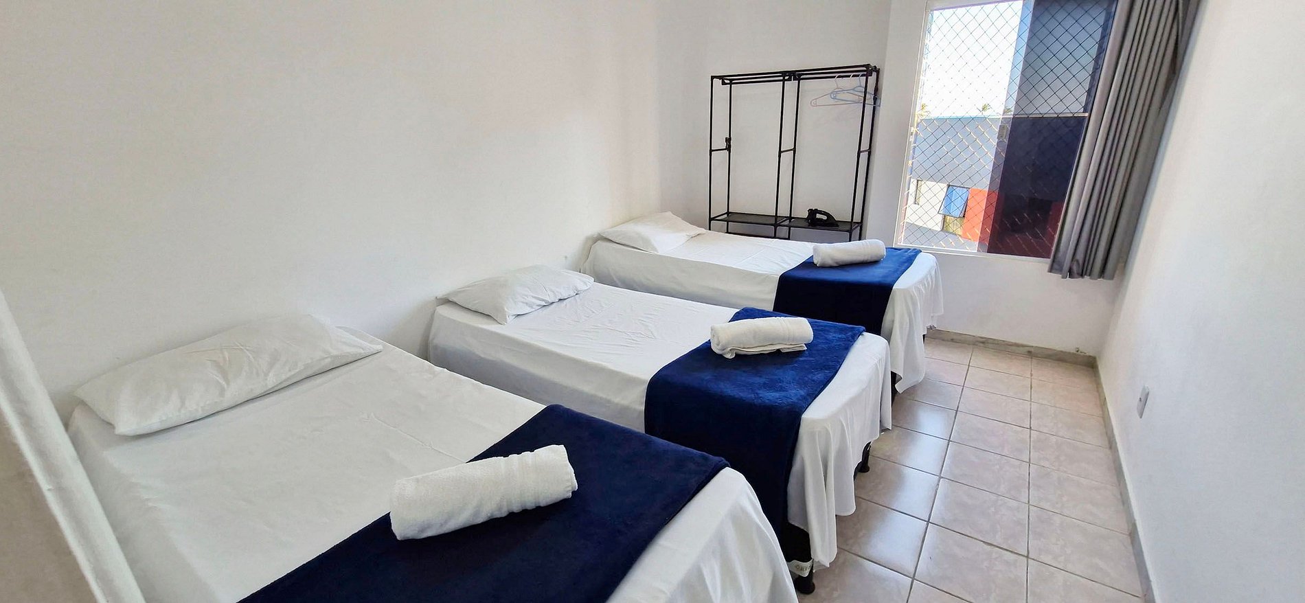 - 3 single beds, ceiling fan, open wardrobe, iron, blackout curtains, safety net