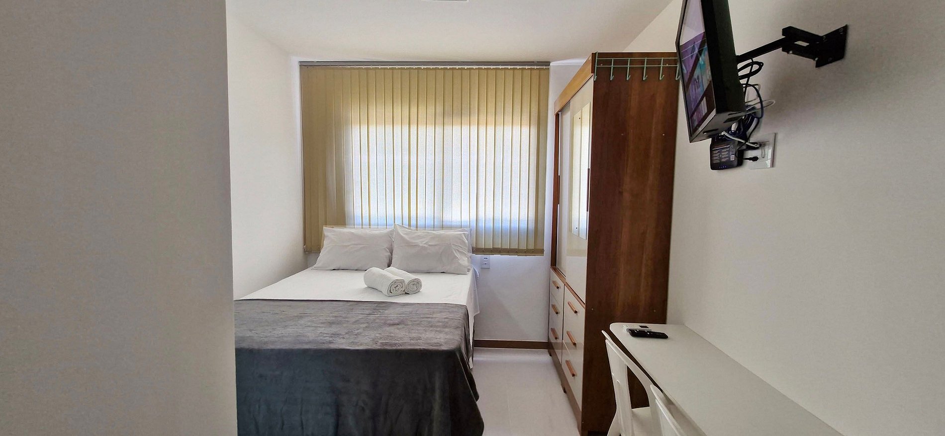 - 15m² studio with double bed, work desk with 2 chairs, smart TV with apps and local channels, WI-FI, split air conditioning, blinds, wardrobe with mirror on the door