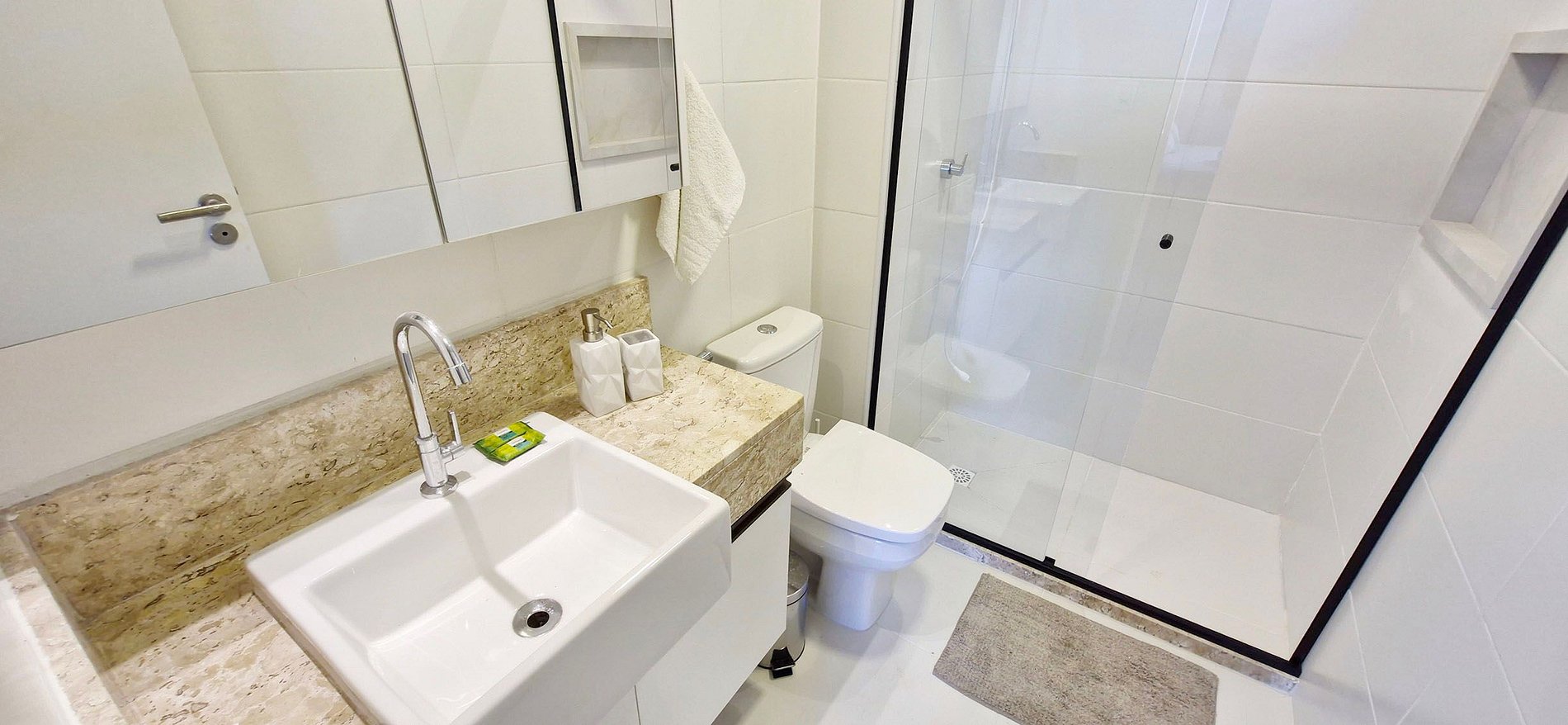 - Bathroom with sink, cabinet, large mirror, blindex shower, electric shower