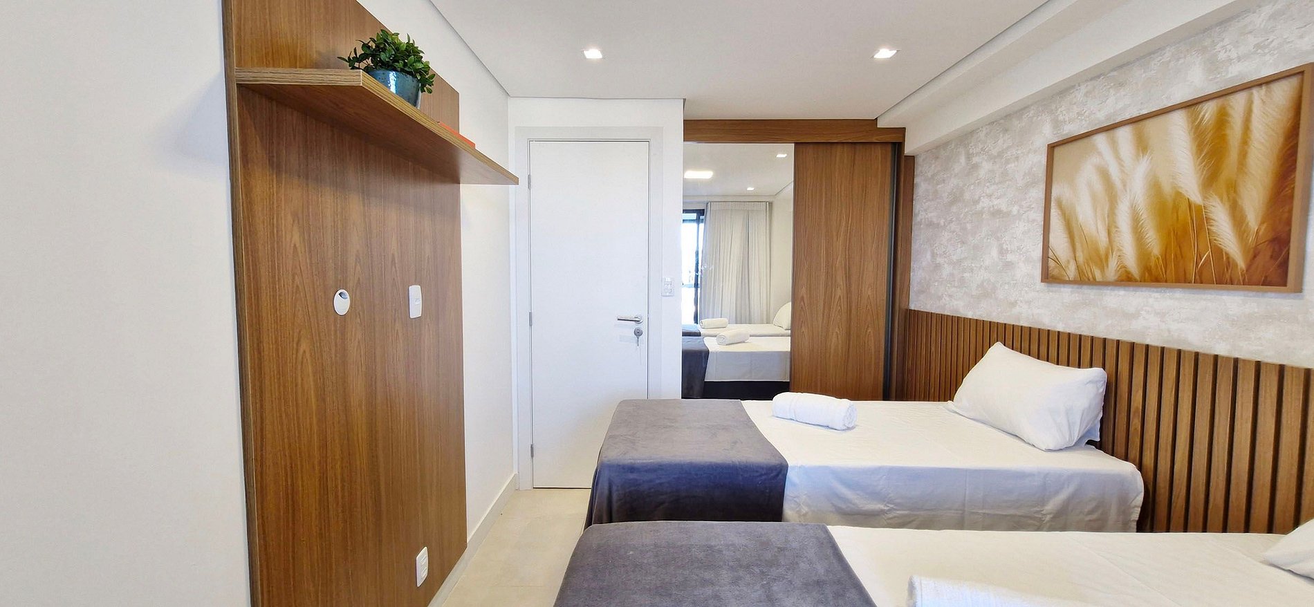 - 2 single beds, split air conditioning, glass door to the balcony, blackout curtains, wooden rack, 1 bedside table, wardrobe with mirror, decorative picture