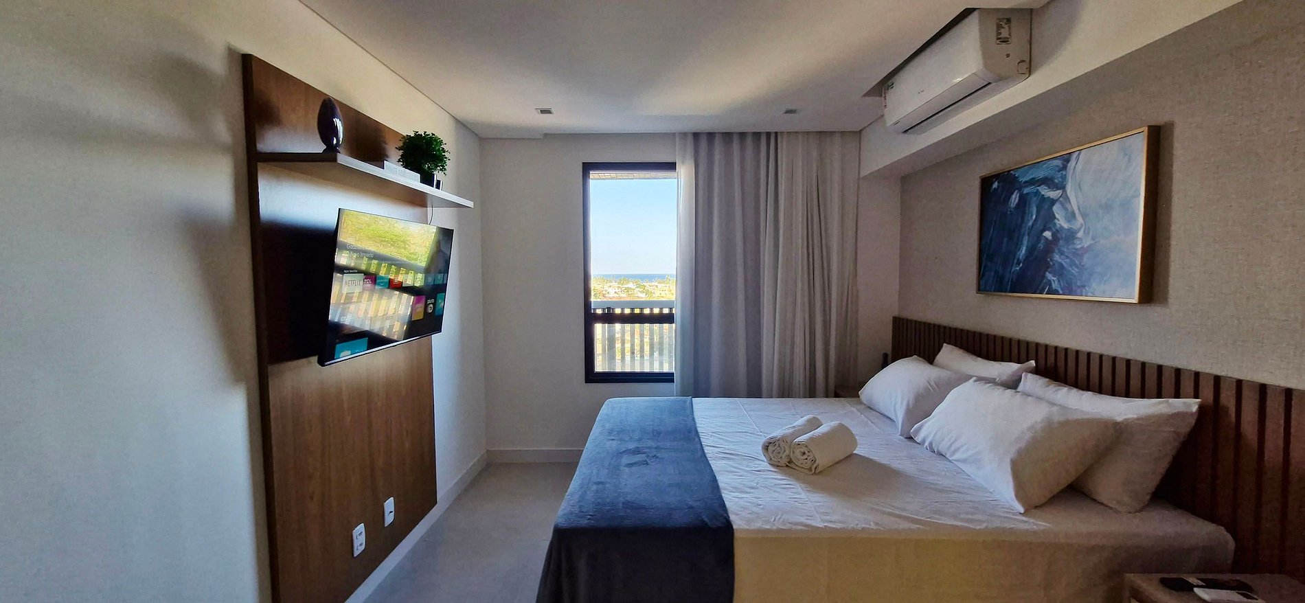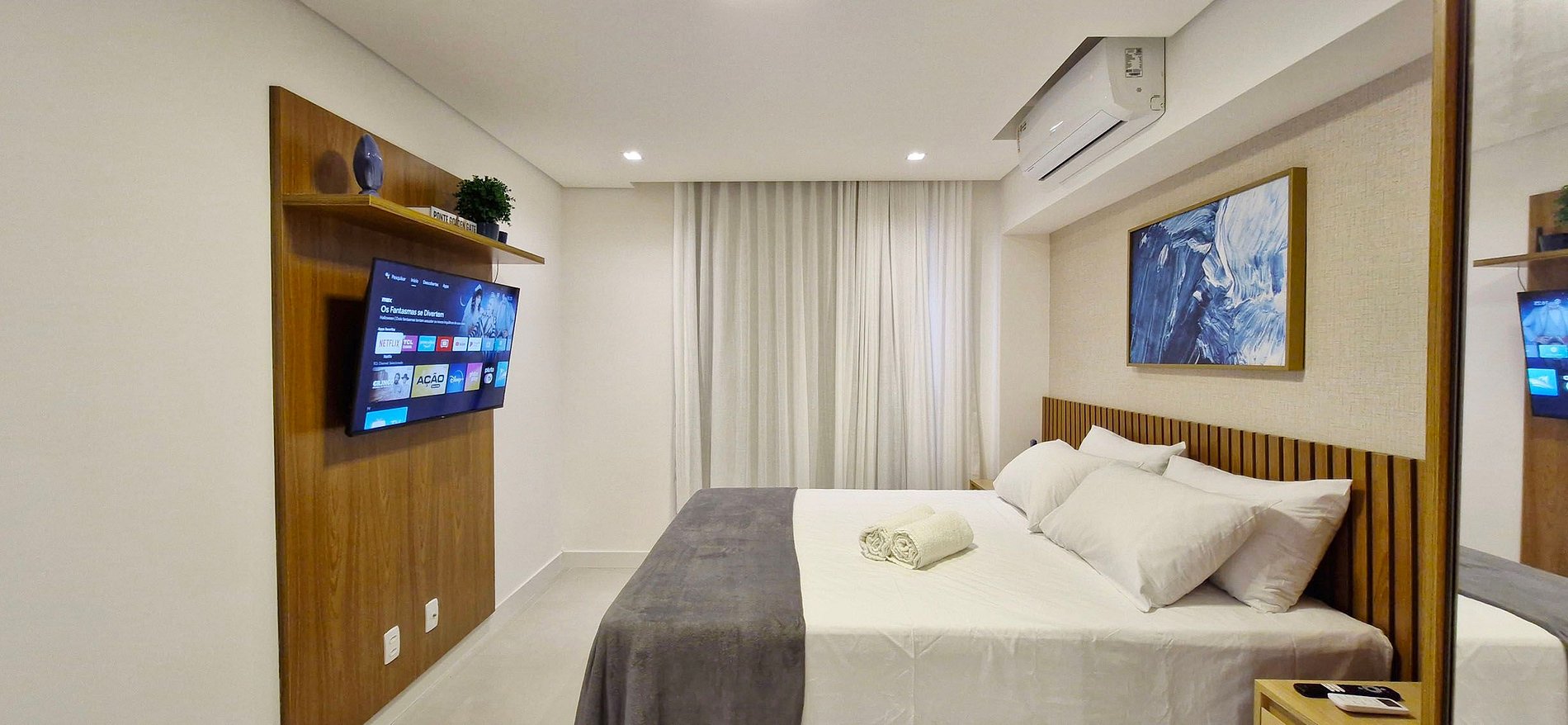 - Queen bed, 2 wooden nightstands, split air conditioning, rack with smart TV (apps and local channels), 2 wardrobes, large mirror, ironing board and iron inside the wardrobe, blackout curtain, painting and decorative items