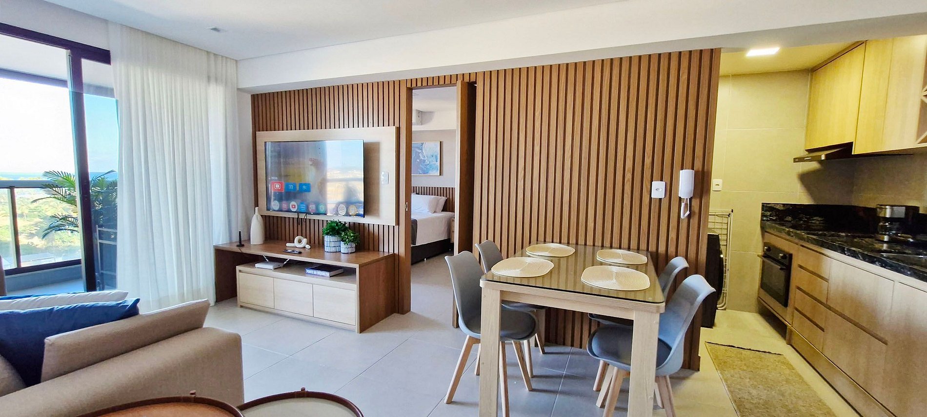 - 4-seater sofa, wooden rack with smart TV (apps and local channels), sliding door to the balcony, thin curtain, 2 round side tables, wooden dining table with glass top and 4 chairs, intercom, WI-FI, 2 paintings and decorative items