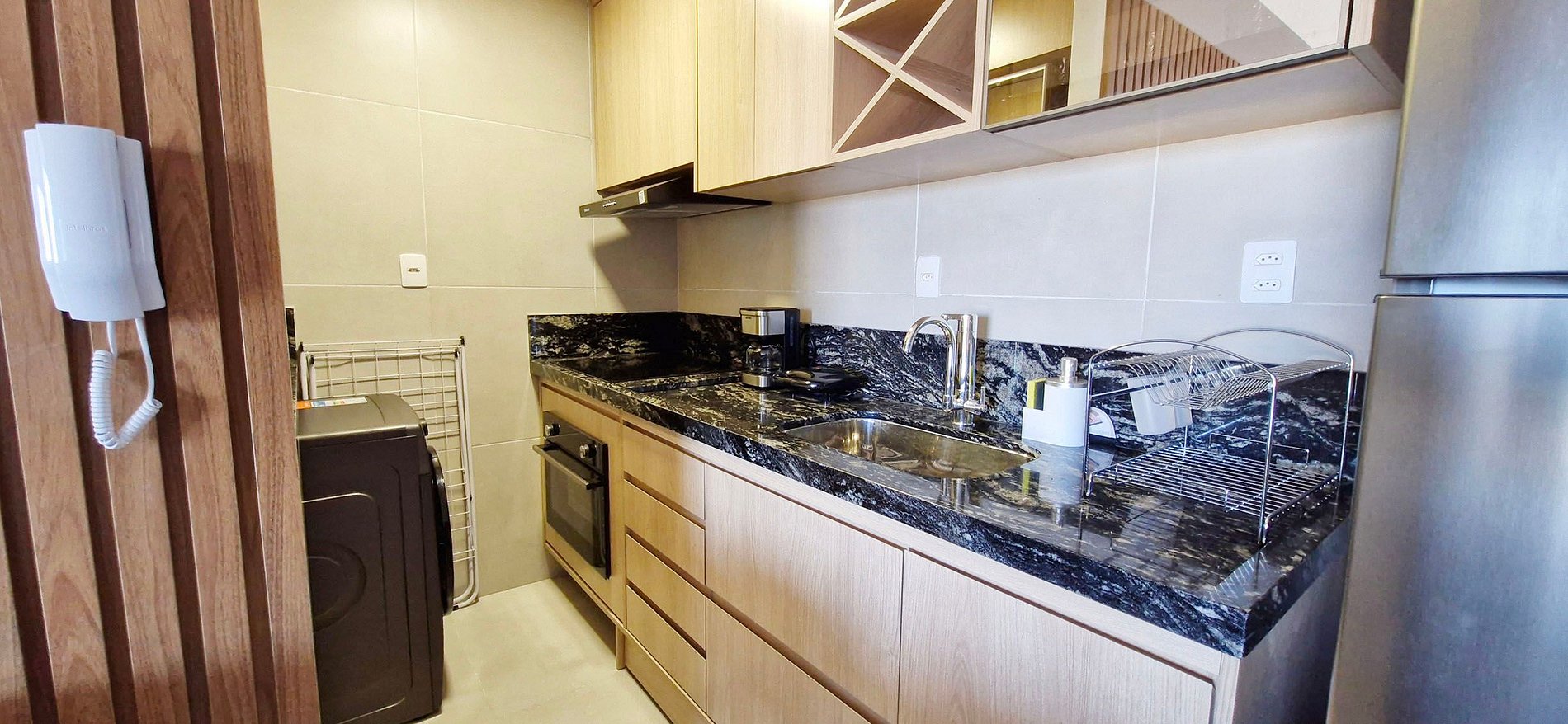 - Duplex refrigerator, sink with water filter, electric coffee maker, blender, sandwich maker, thermos, 4-burner induction cooktop, air purifier, electric oven, pots, cutlery, pans and various kitchen accessories