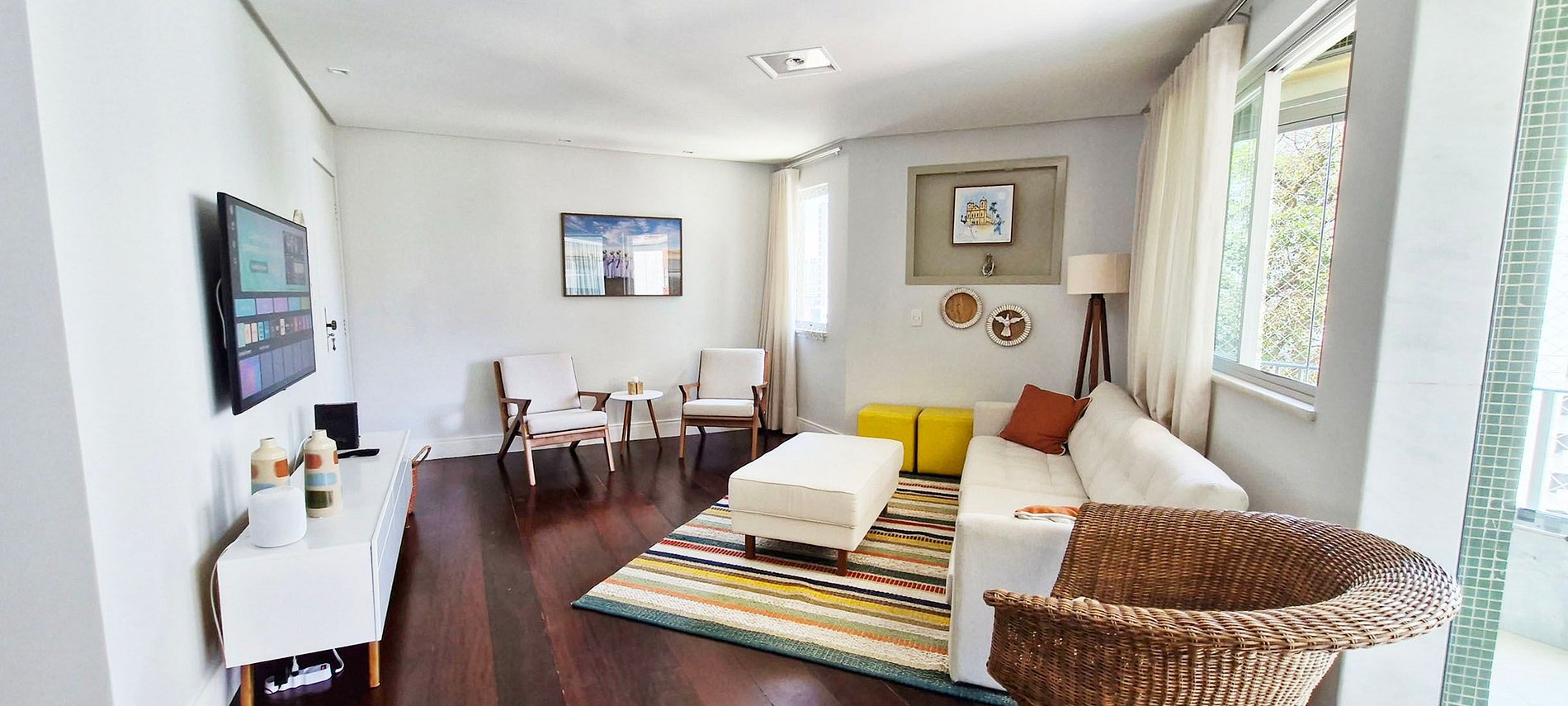 LIVING ROOM - large sofa, 2 yellow ottomans, 2 padded chairs, small round table, rectangular padded ottoman, 2 pillows, floor lamp, wicker armchair, rack with decorative items and WI-FI, rug, smart TV with apps and local channels, blackout curtains, decorative paintings