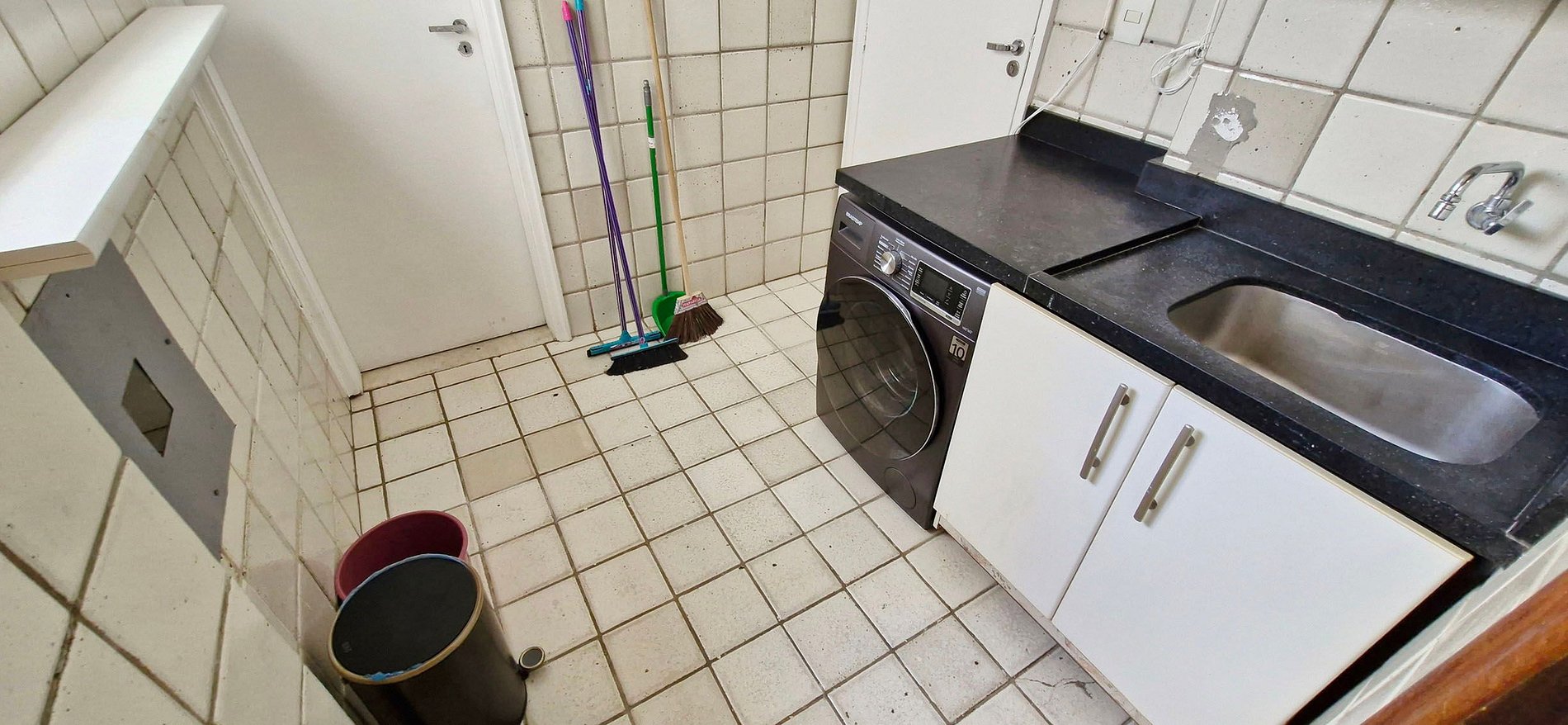 SERVICE AREA - sink with cabinet, washer and dryer, ceiling clothesline, 2 buckets, broom, squeegee and dustpan