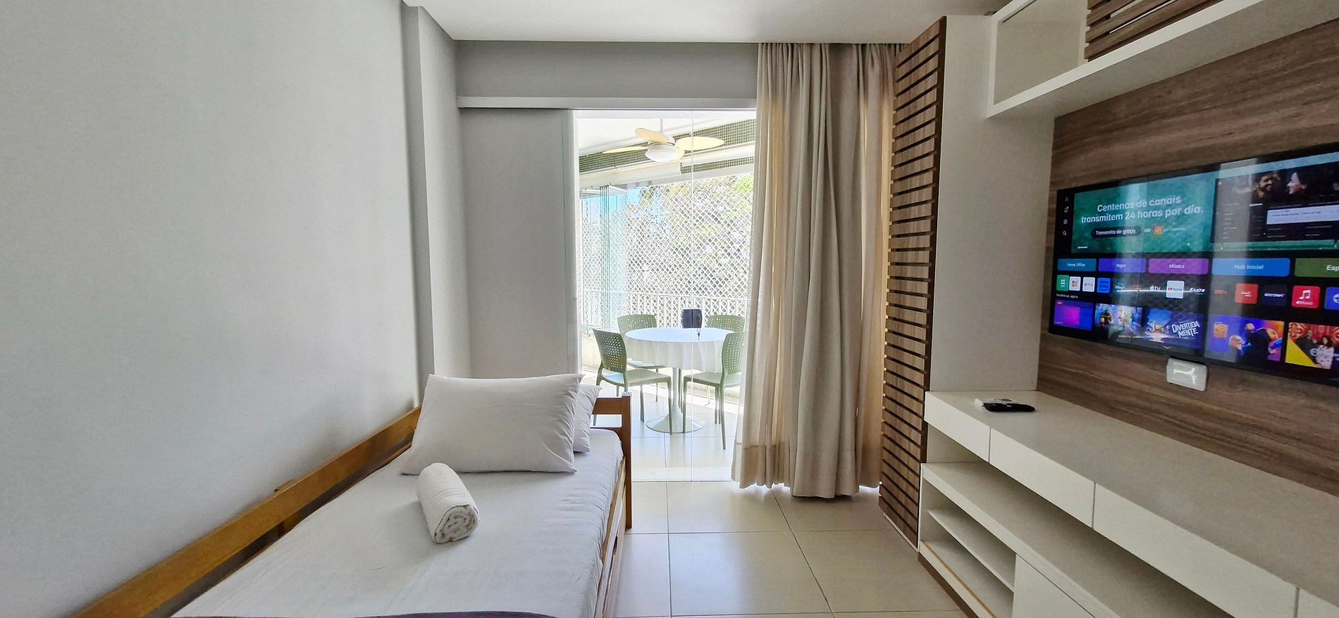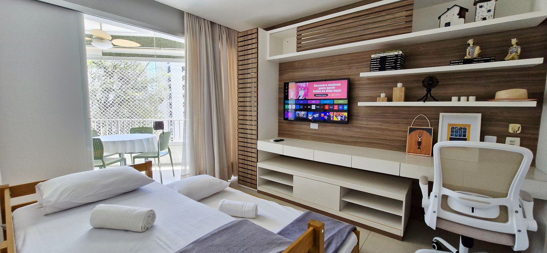 BEDROOM 2 - single bunk bed, bookshelf with desk, armchair, rack, smart TV with apps and local channels, split air conditioning, curtain, glass door to the balcony, books and decorative items