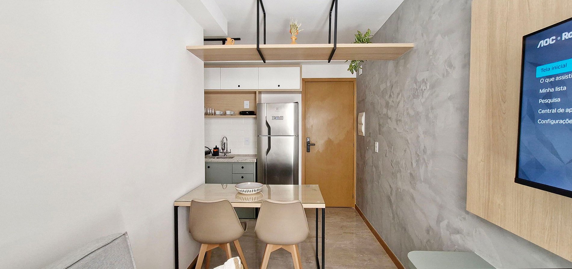 - Counter with 2 chairs, duplex refrigerator, electric oven, induction cooktop with 4 burners, air purifier, water filter, microwave, sandwich maker, blender, electric coffee maker, electric kettle, pans, cutlery, plates and basic kitchen items.