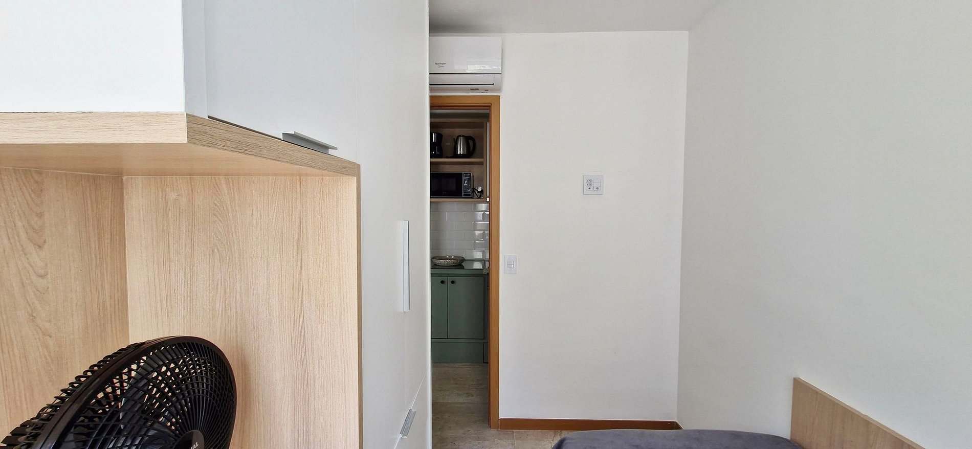 2/4 apartment with 30m², well decorated, in Costa Azul! 5min from the beach, close to supermarket, pharmacy and shops. Bedroom (1) with double bed, split air conditioning, wardrobe. Bedroom (2) with single bed, work area, split air conditioning and wardrobe. Living room with smart TV and sofa. Equipped kitchen. Gym, swimming pool, co-working, 1 rotating parking space (only small vehicles).